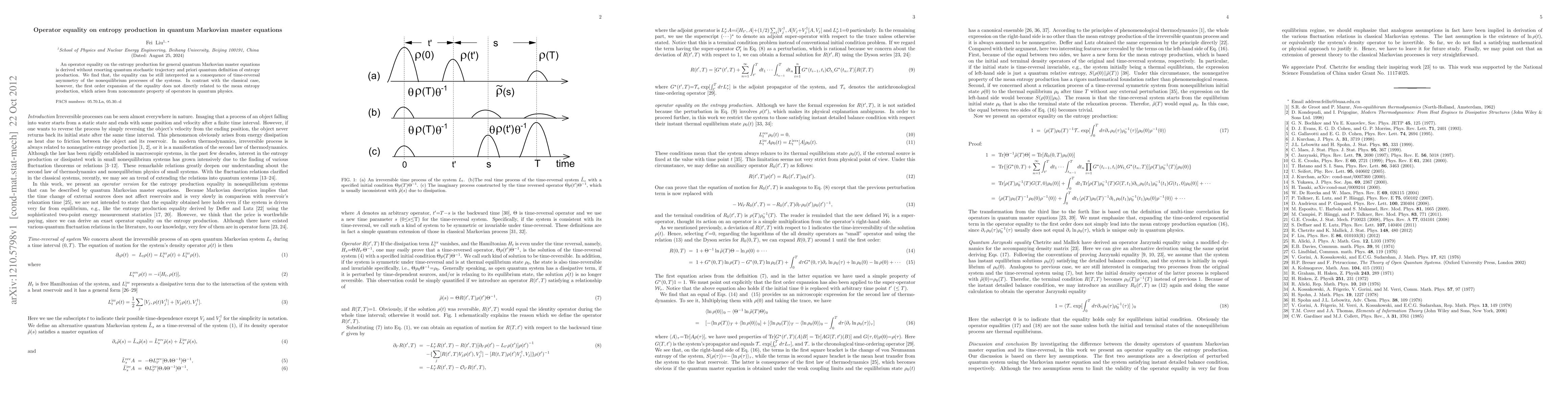 Summary: This paper derives an operator equality for entropy production in quantum Markovian master equations without relying on quantum stochastic trajectories or a predefined quantum entropy production definition. The equality reflects time-reversal asymmetry in nonequilibrium processes, but unlike in classical systems, its first-order expansion does not directly correlate with mean entropy production due to the noncommutative nature of quantum operators.