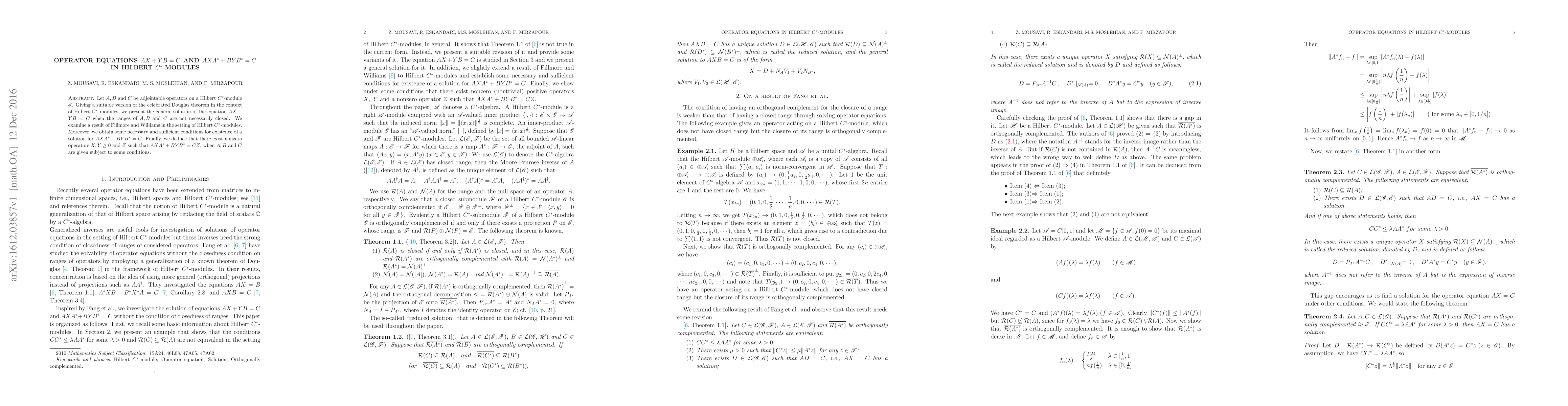 Let $A,B$ and $C$ be adjointable operators on a Hilbert $C^*$-module $\mathscr{E}$. Giving a suitable version of the celebrated Douglas theorem in the context of Hilbert $C^*$-modules, we present the general solution of the equation $AX+YB=C$ when the ranges of $A,B$ and $C$ are not necessarily closed. We examine a result of Fillmore and Williams in the setting of Hilbert $C^*$-modules. Moreover, we obtain some necessary and sufficient conditions for existence of a solution for $AXA^*+BYB^*=C$. Finally, we deduce that there exist nonzero operators $X, Y\geq 0$ and $Z$ such that $AXA^*+BYB^*=CZ$, when $A, B$ and $C$ are given subject to some conditions.