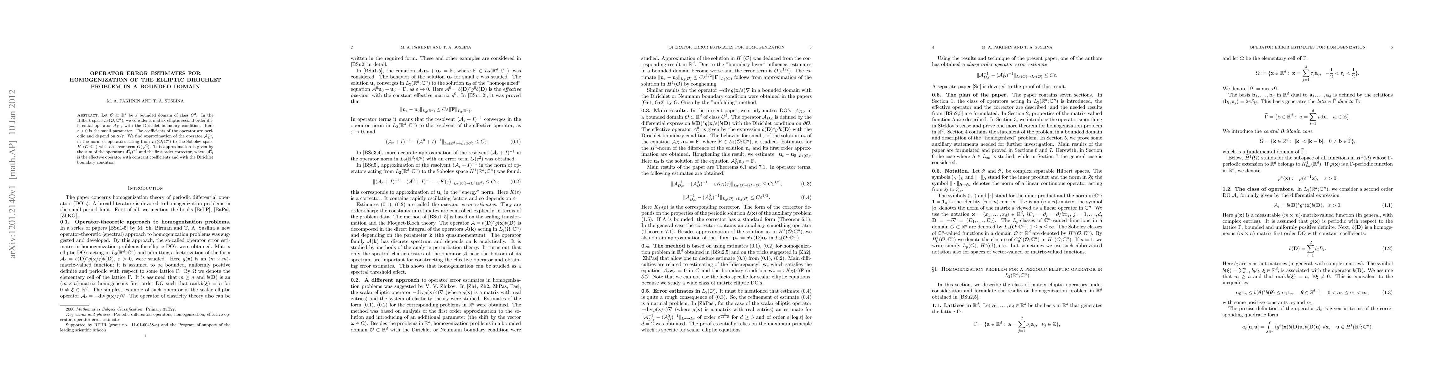 This paper provides operator error estimates for homogenizing an elliptic Dirichlet problem in a bounded domain, showing that the inverse of the small-parameter dependent operator can be approximated with an error term of $O(\sqrt{\varepsilon})$ by the sum of the inverse of the effective operator and a first-order corrector.