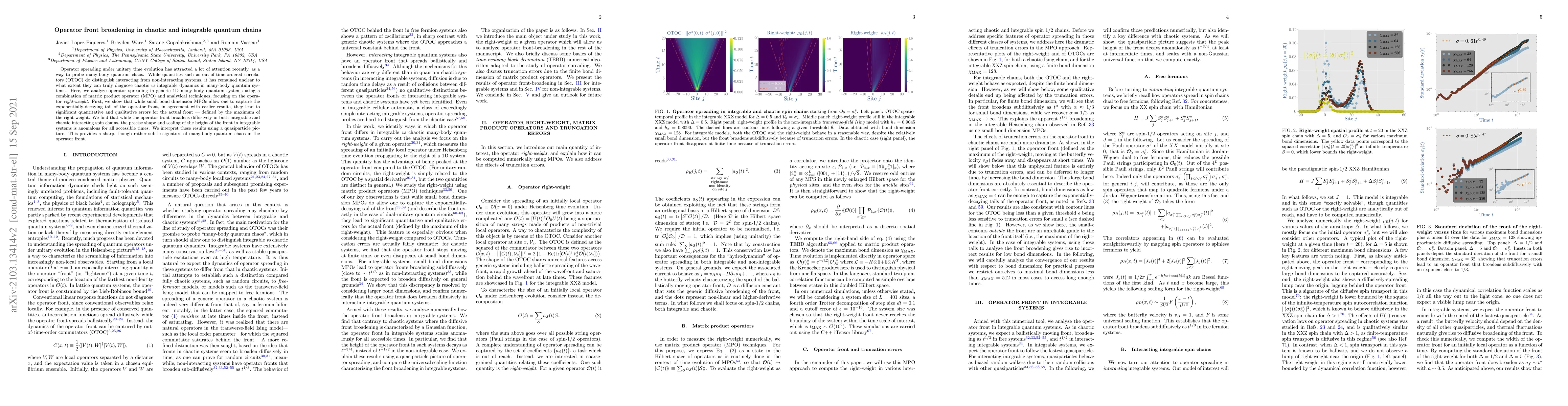 This paper investigates operator spreading in 1D many-body quantum systems, revealing that while operator front broadening occurs similarly in both chaotic and integrable systems, the precise shape and scaling of the front's height in integrable systems is anomalous, providing a subtle signature of quantum chaos.