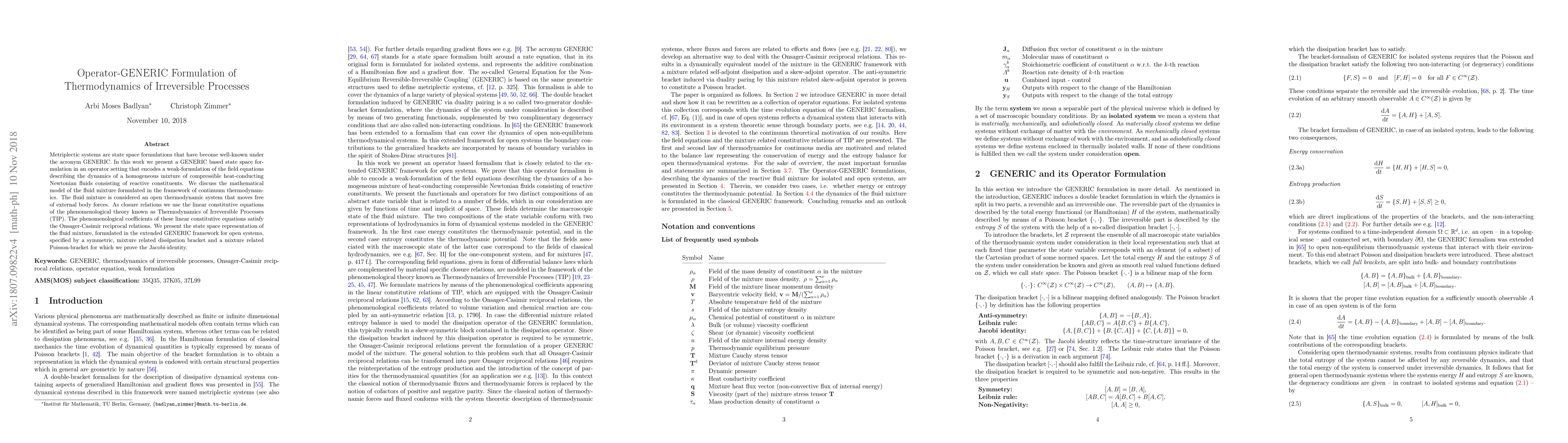 This paper develops an operator-GENERIC formulation for the thermodynamics of irreversible processes in a reactive, homogeneous mixture of compressible, heat-conducting Newtonian fluids. It employs linear constitutive equations from Thermodynamics of Irreversible Processes (TIP) and proves the Jacobi-identity for the mixture-related dissipation and Poisson brackets.