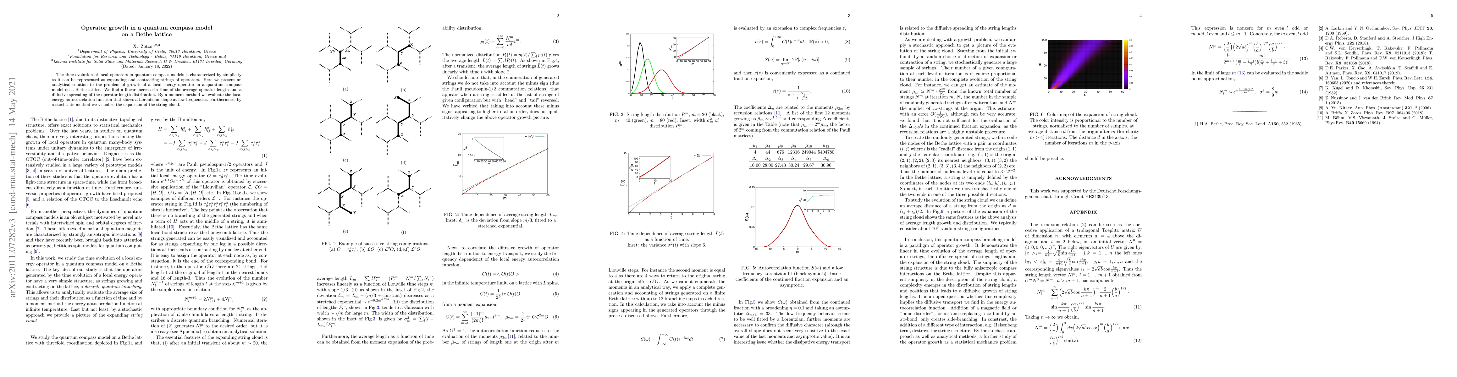 The time evolution of local operators in quantum compass models is characterized by simplicity as it can be represented as expanding and contracting strings of operators. Here we present an analytical solution to the problem of growth of a local energy operator in a quantum compass model on a Bethe lattice. We find a linear increase in time of the average operator length and a diffusive spreading of the operator length distribution. By a moment method we evaluate the local energy autocorrelation function that shows a Lorentzian shape at low frequencies. Furthermore, by a stochastic method we visualize the expansion of the string cloud.