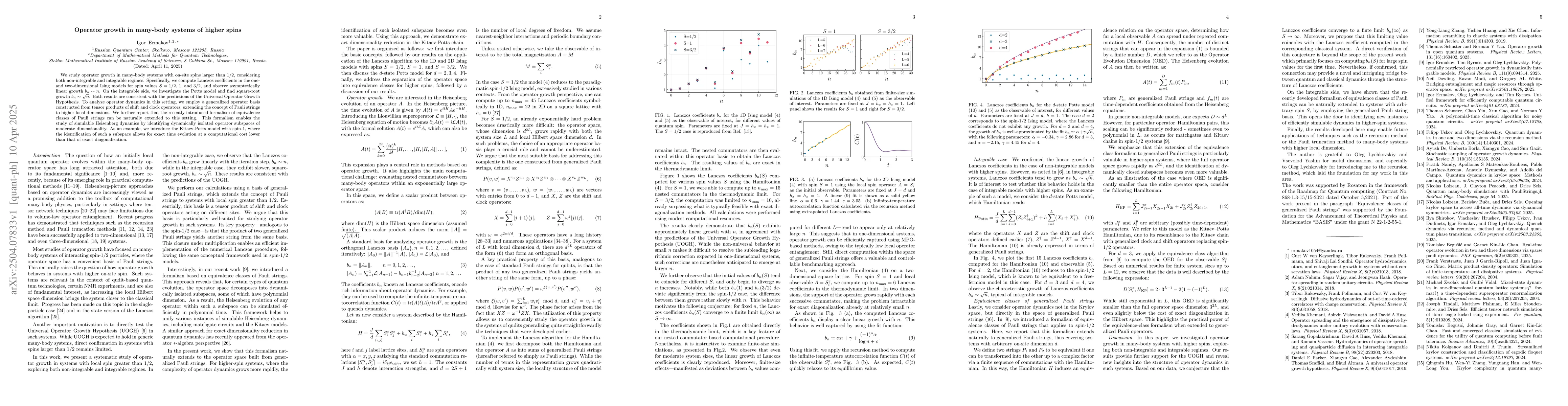 The study investigates operator growth in many-body systems with higher spins, applying the Lanczos algorithm to 1D and 2D Ising models for spin values S=1/2, 1, and 3/2, and the d-state Potts model. A generalized operator basis constructed from tensor products of shift and clock operators is used, extending the concept of Pauli strings to higher local dimensions.