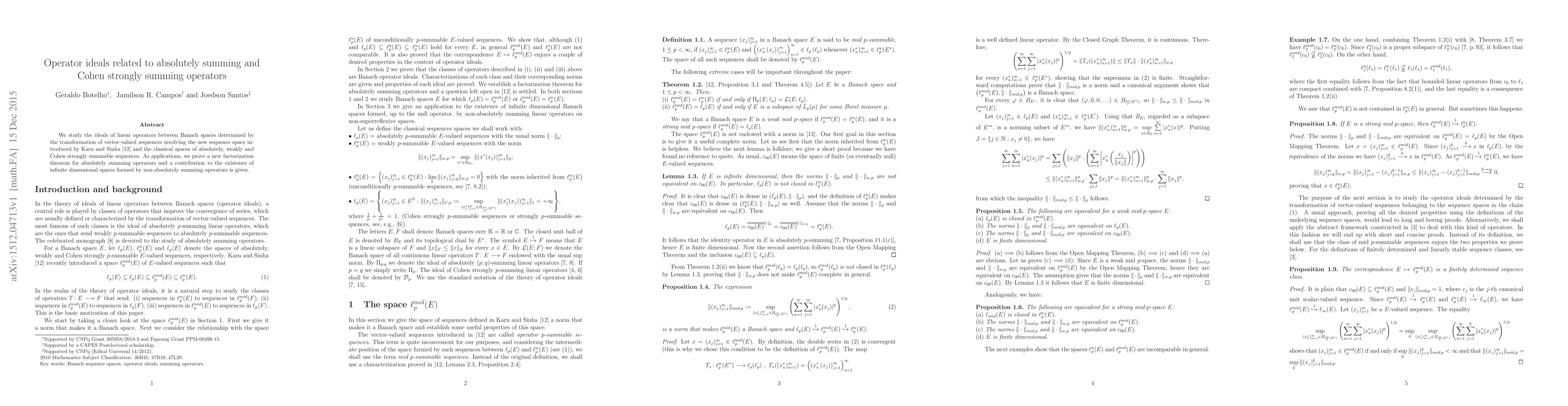 This paper investigates the operator ideals linked to absolutely summing and Cohen strongly summing operators, focusing on new sequence spaces and classical summable sequence spaces. It presents a novel factorization theorem for absolutely summing operators and contributes to the existence of infinite-dimensional spaces with non-absolutely summing operators.