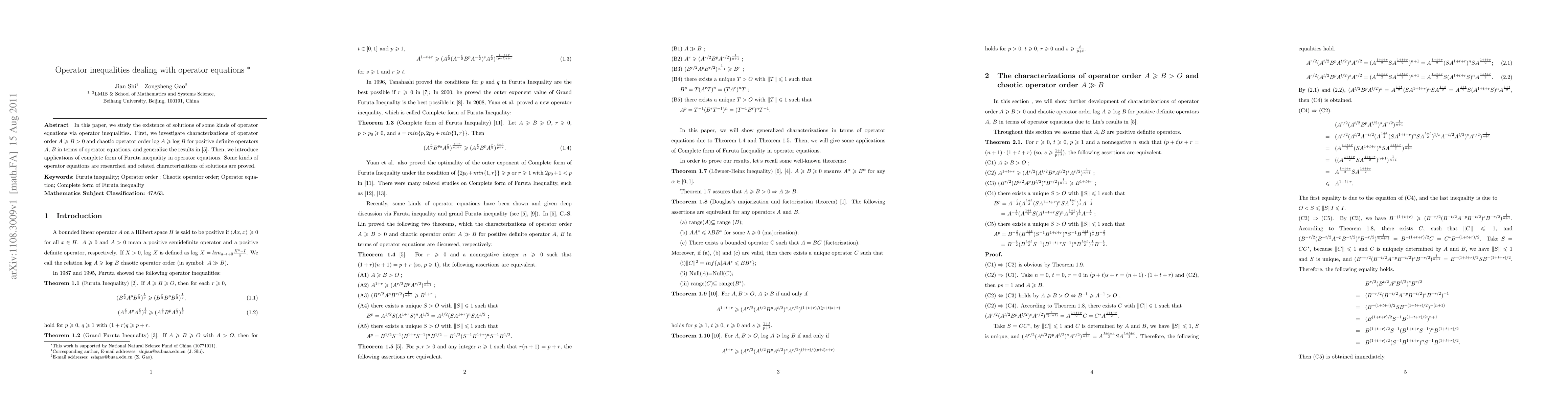 This paper explores the existence of solutions to operator equations through operator inequalities, focusing on characterizing operator orders and applying the complete form of Furuta inequality. It generalizes previous results and proves related characterizations of solutions for specific operator equations.