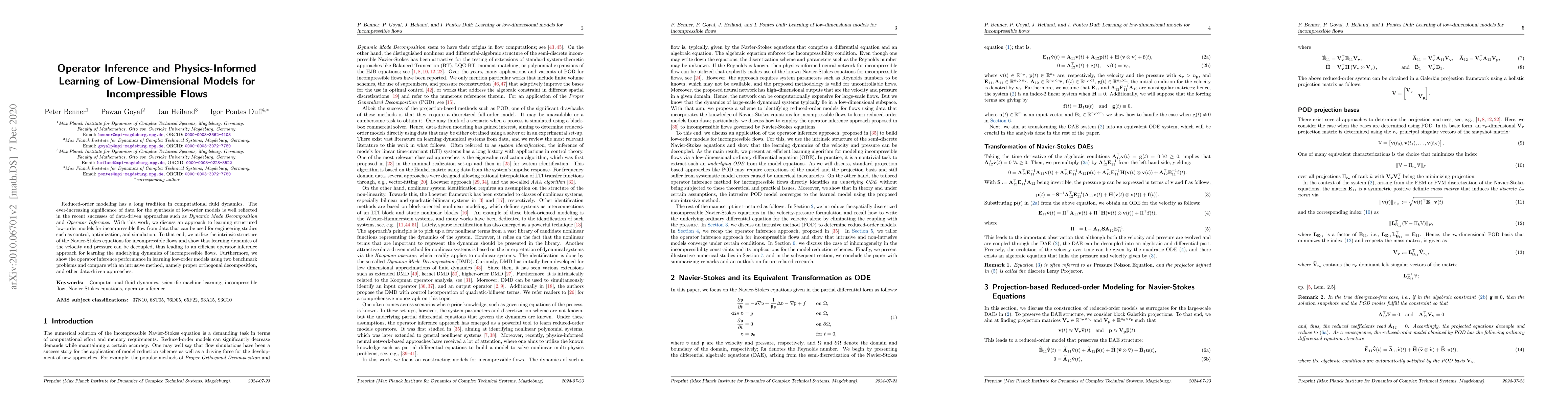 This paper proposes a novel data-driven approach for learning low-order models of incompressible flows by decoupling the dynamics of velocity and pressure using operator inference, leveraging the structure of the Navier-Stokes equations. The method is demonstrated on benchmark problems and compared against proper orthogonal decomposition and other data-driven techniques.