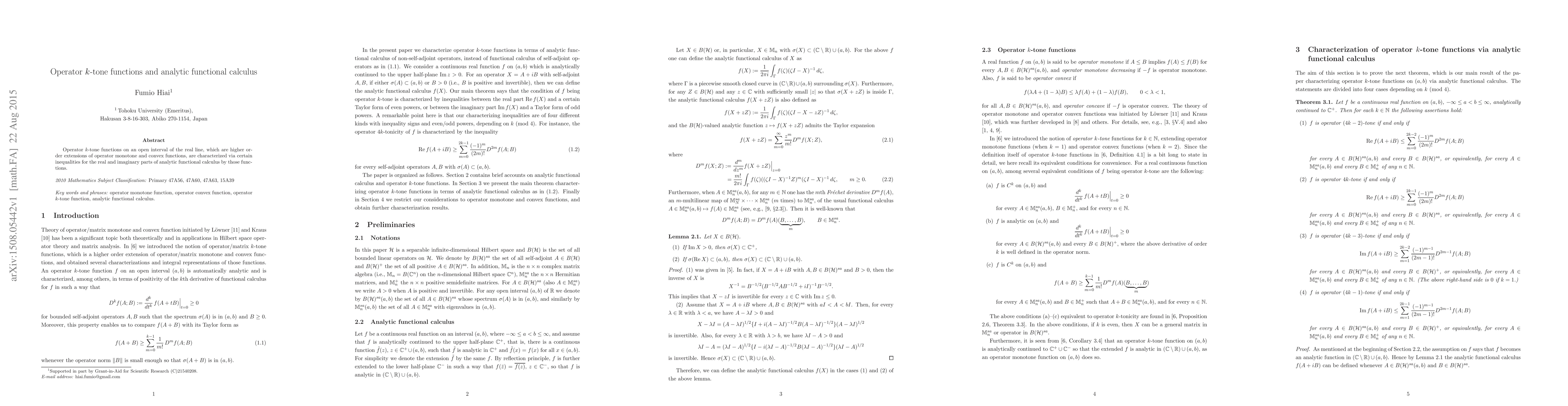 This paper characterizes operator $k$-tone functions through inequalities involving the real and imaginary parts of analytic functional calculus, extending the concepts of operator monotone and convex functions to higher orders. The study focuses on these functions defined on an open interval of the real line.