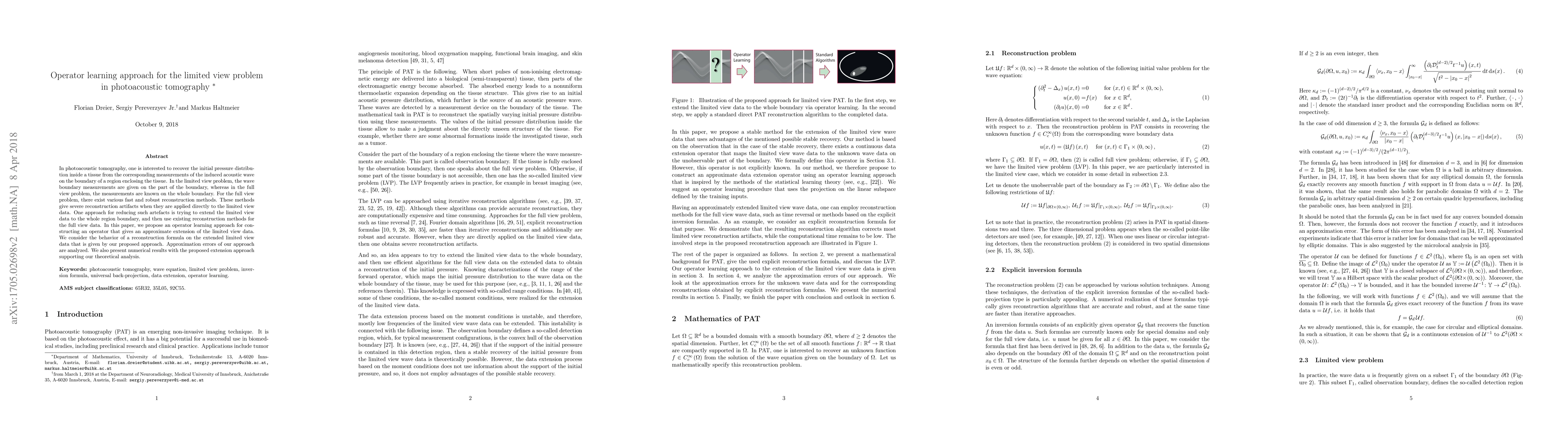 In photoacoustic tomography, one is interested to recover the initial pressure distribution inside a tissue from the corresponding measurements of the induced acoustic wave on the boundary of a region enclosing the tissue. In the limited view problem, the wave boundary measurements are given on the part of the boundary, whereas in the full view problem, the measurements are known on the whole boundary. For the full view problem, there exist various fast and robust reconstruction methods. These methods give severe reconstruction artifacts when they are applied directly to the limited view data. One approach for reducing such artefacts is trying to extend the limited view data to the whole region boundary, and then use existing reconstruction methods for the full view data. In this paper, we propose an operator learning approach for constructing an operator that gives an approximate extension of the limited view data. We consider the behavior of a reconstruction formula on the extended limited view data that is given by our proposed approach. Approximation errors of our approach are analyzed. We also present numerical results with the proposed extension approach supporting our theoretical analysis.