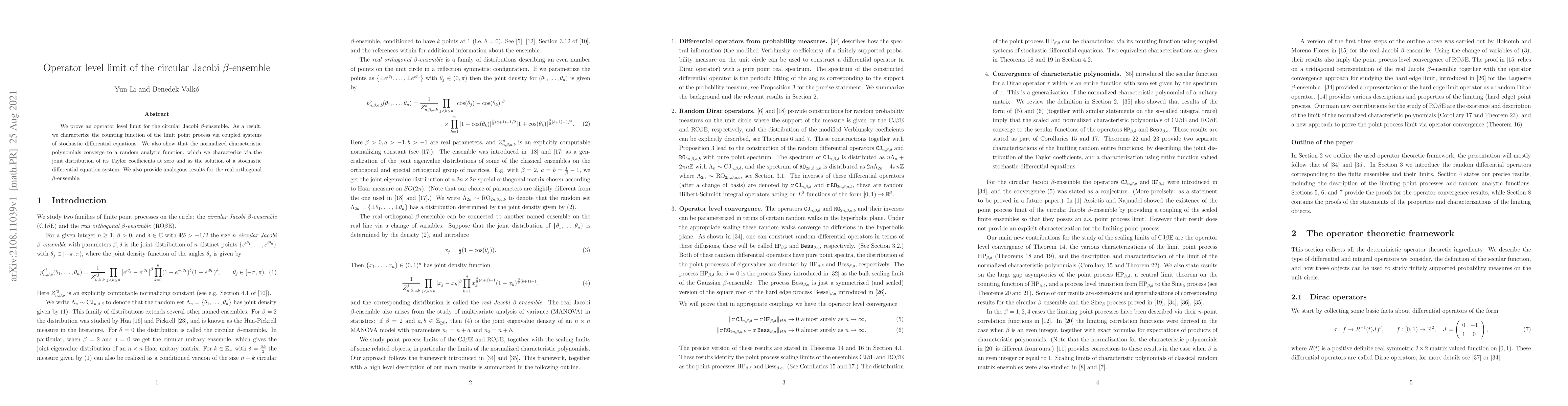 The paper proves an operator-level limit for the circular Jacobi β-ensemble, characterizing its counting function via coupled stochastic differential equations and a random analytic function with a specific distribution of Taylor coefficients.