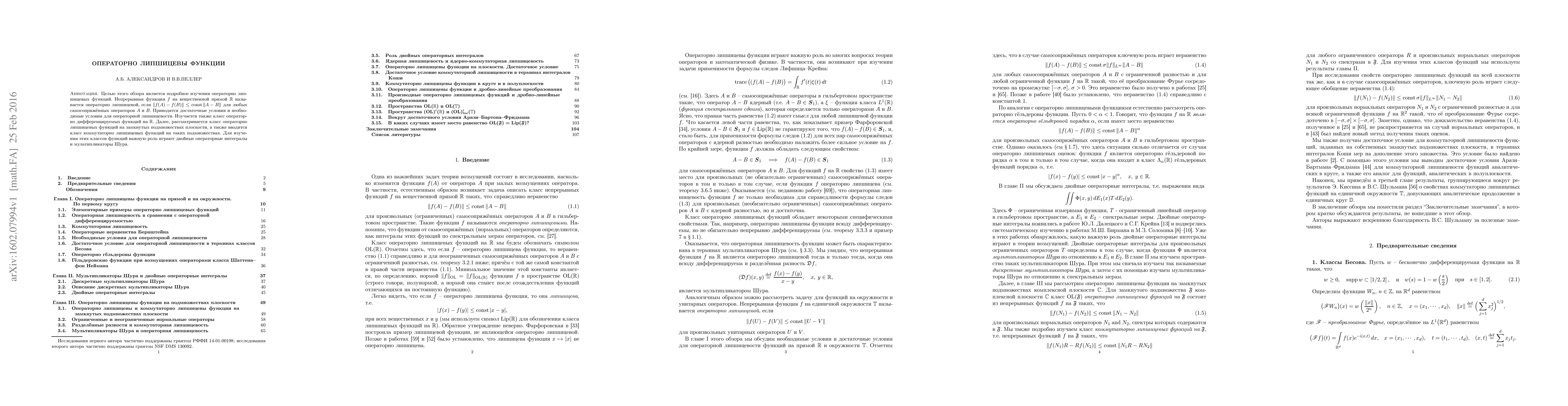 The purpose of this survey article is a comprehensive study of operator Lipschitz functions. A continuous function $f$ on the real line ${\Bbb R}$ is called operator Lipschitz if $\|f(A)-f(B)\|\le{\rm const}\|A-B\|$ for arbitrary self-adjoint operators $A$ and $B$. We give sufficient conditions and necessary conditions for operator Lipschitzness. We also study the class of operator differentiable functions on ${\Bbb R}$. Then we consider operator Lipschitz functions on closed subsets of the plane as well as commutator Lipschitz functions on such subsets. Am important role is played by double operator integrals and Schur multipliers.