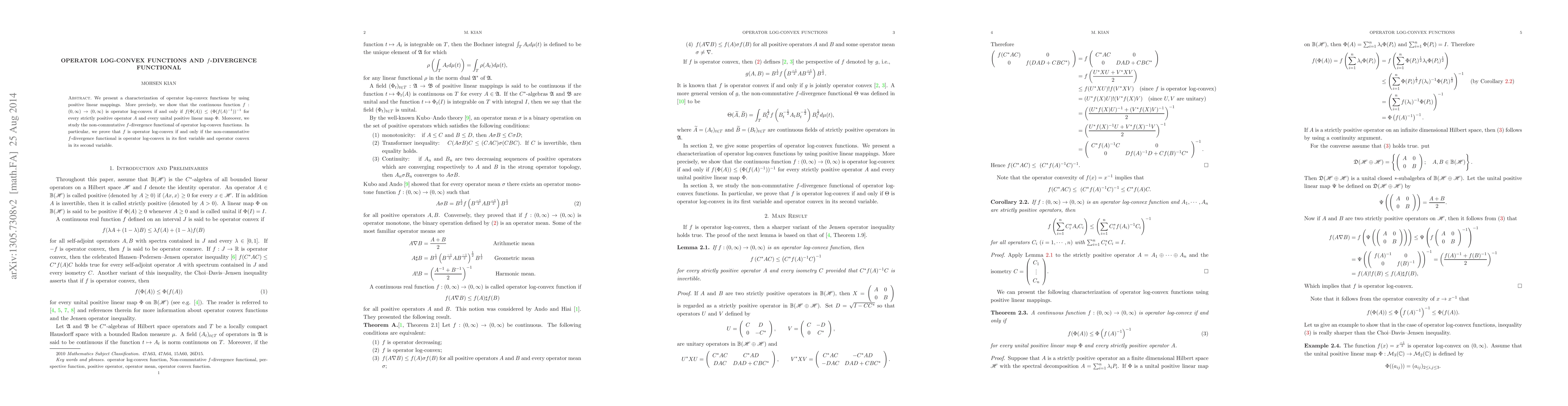 The paper characterizes operator log-convex functions via positive linear mappings and explores the non-commutative f-divergence functional, proving that f is operator log-convex if it makes the f-divergence functional operator log-convex in the first variable and operator convex in the second.