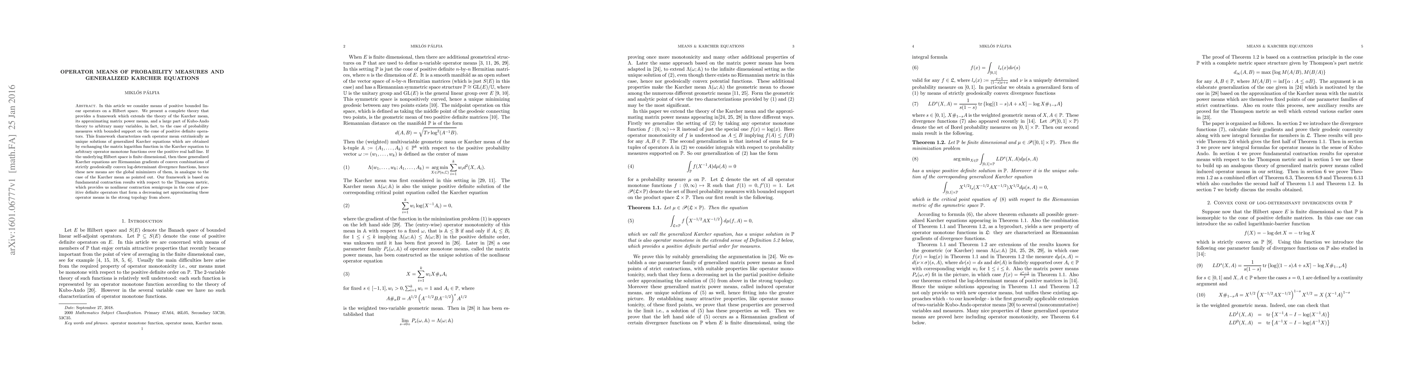 In this article we consider means of positive bounded linear operators on a Hilbert space. We present a complete theory that provides a framework which extends the theory of the Karcher mean, its approximating matrix power means, and a large part of Kubo-Ando theory to arbitrary many variables, in fact, to the case of probability measures with bounded support on the cone of positive definite operators. This framework characterizes each operator mean extrinsically as unique solutions of generalized Karcher equations which are obtained by exchanging the matrix logarithm function in the Karcher equation to arbitrary operator monotone functions over the positive real half-line. If the underlying Hilbert space is finite dimensional, then these generalized Karcher equations are Riemannian gradients of convex combinations of strictly geodesically convex log-determinant divergence functions, hence these new means are the global minimizers of them, in analogue to the case of the Karcher mean as pointed out. Our framework is based on fundamental contraction results with respect to the Thompson metric, which provides us nonlinear contraction semigroups in the cone of positive definite operators that form a decreasing net approximating these operator means in the strong topology from above.