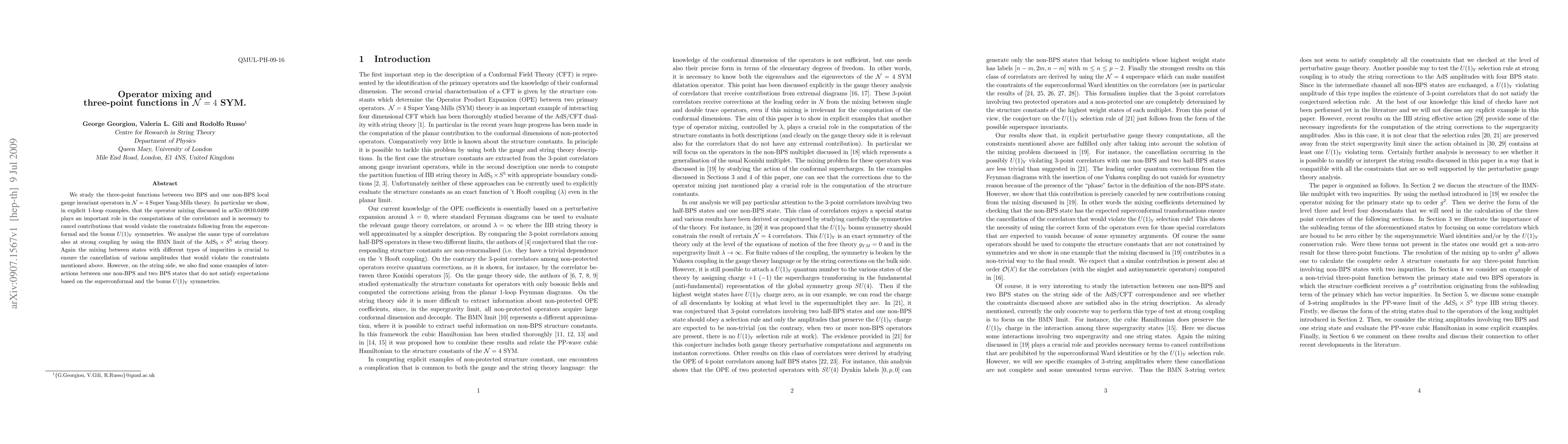 This research investigates three-point correlators in N=4 Super Yang-Mills theory, demonstrating the importance of operator mixing in 1-loop calculations to satisfy superconformal and U(1)_Y symmetry constraints. It also examines strong coupling behavior via the BMN limit of AdS_5xS^5 string theory, finding that mixing is essential for amplitude cancellation, though some string interactions violate expected symmetries.