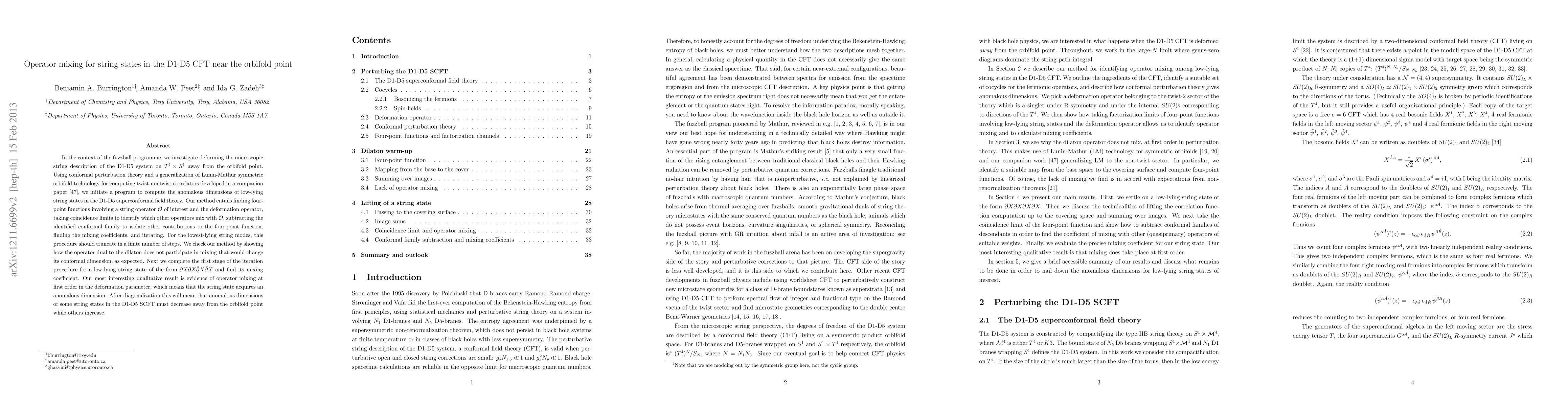 In the context of the fuzzball programme, we investigate deforming the microscopic string description of the D1-D5 system on T^4xS^1 away from the orbifold point. Using conformal perturbation theory and a generalization of Lunin-Mathur symmetric orbifold technology for computing twist-nontwist correlators developed in a companion work, we initiate a program to compute the anomalous dimensions of low-lying string states in the D1-D5 superconformal field theory. Our method entails finding four-point functions involving a string operator O of interest and the deformation operator, taking coincidence limits to identify which other operators mix with O, subtracting the identified conformal family to isolate other contributions to the four-point function, finding the mixing coefficients, and iterating. For the lowest-lying string modes, this procedure should truncate in a finite number of steps. We check our method by showing how the operator dual to the dilaton does not participate in mixing that would change its conformal dimension, as expected. Next we complete the first stage of the iteration procedure for a low-lying string state of the form \partial X \partial X \bar\partial X \bar\partial X and find its mixing coefficient. Our main qualitative result is evidence of operator mixing at first order in the deformation parameter, which means that the string state acquires an anomalous dimension. After diagonalization this will mean that anomalous dimensions of some string states in the D1-D5 SCFT must decrease away from the orbifold point while others increase.