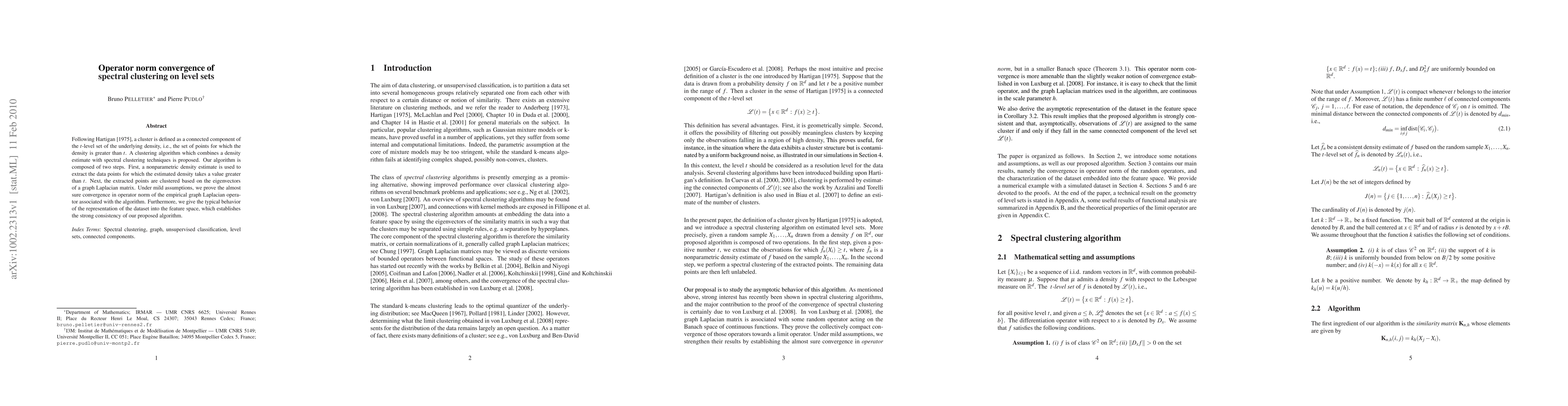 This paper proposes a clustering algorithm combining a nonparametric density estimate and spectral clustering on t-level sets. It demonstrates almost sure convergence in operator norm of the empirical graph Laplacian operator and establishes the strong consistency of the algorithm under mild assumptions.