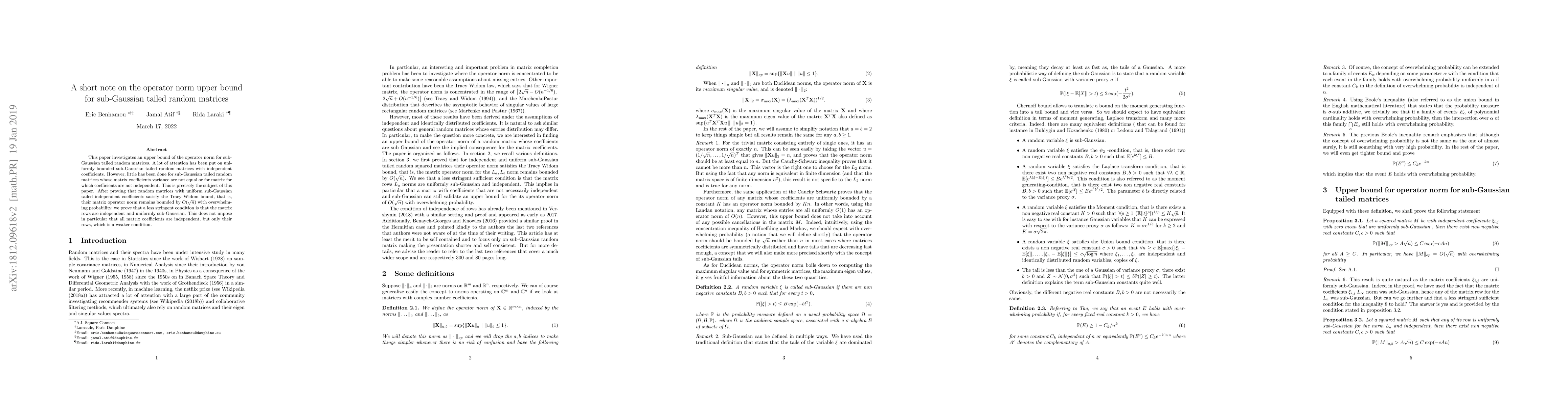 This paper investigates an upper bound of the operator norm for sub-Gaussian tailed random matrices. A lot of attention has been put on uniformly bounded sub-Gaussian tailed random matrices with independent coefficients. However, little has been done for sub-Gaussian tailed random matrices whose matrix coefficients variance are not equal or for matrix for which coefficients are not independent. This is precisely the subject of this paper. After proving that random matrices with uniform sub-Gaussian tailed independent coefficients satisfy the Tracy Widom bound, that is, their matrix operator norm remains bounded by $O(\sqrt n )$ with overwhelming probability, we prove that a less stringent condition is that the matrix rows are independent and uniformly sub-Gaussian. This does not impose in particular that all matrix coefficients are independent, but only their rows, which is a weaker condition.