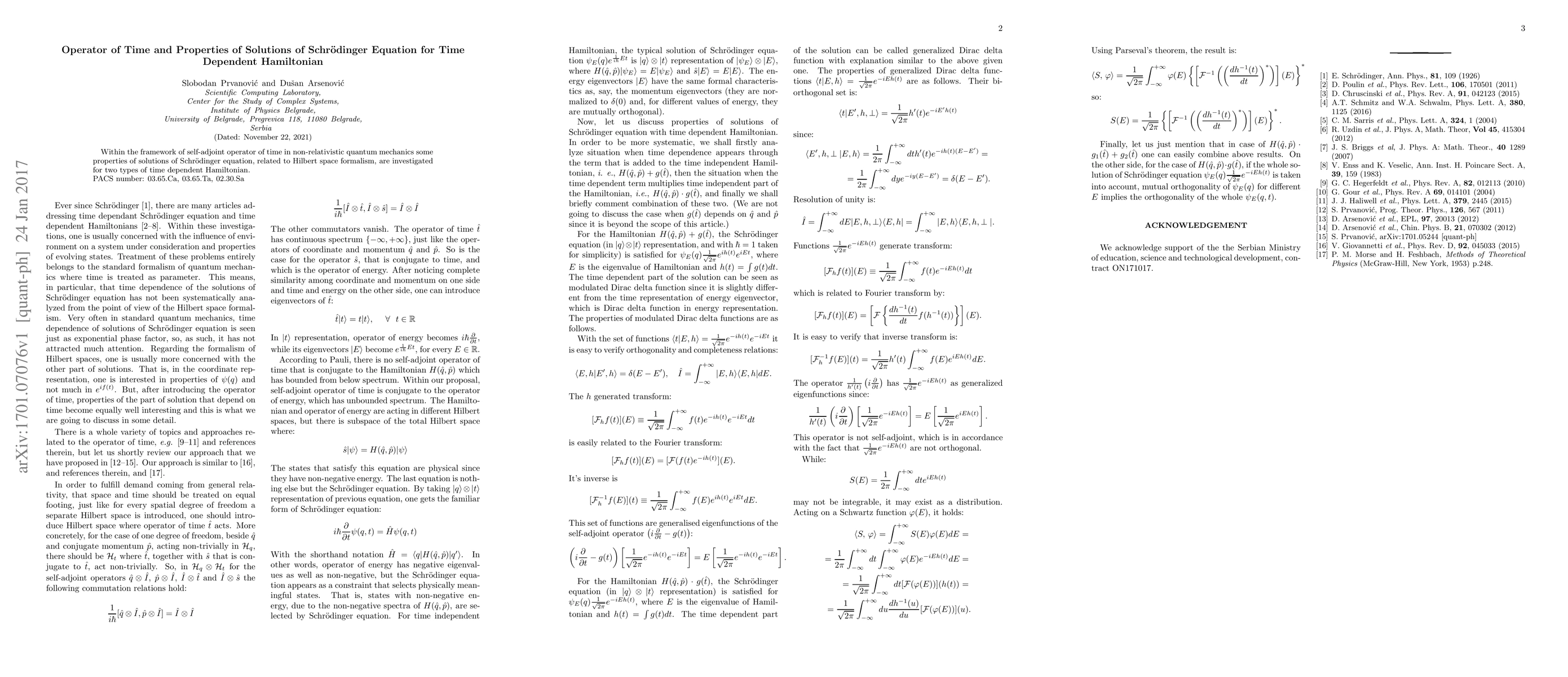 Within the framework of self-adjoint operator of time in non-relativistic quantum mechanics some properties of solutions of Schroedinger equation, related to Hilbert space formalism, are investigated for two types of time dependent Hamiltonian.