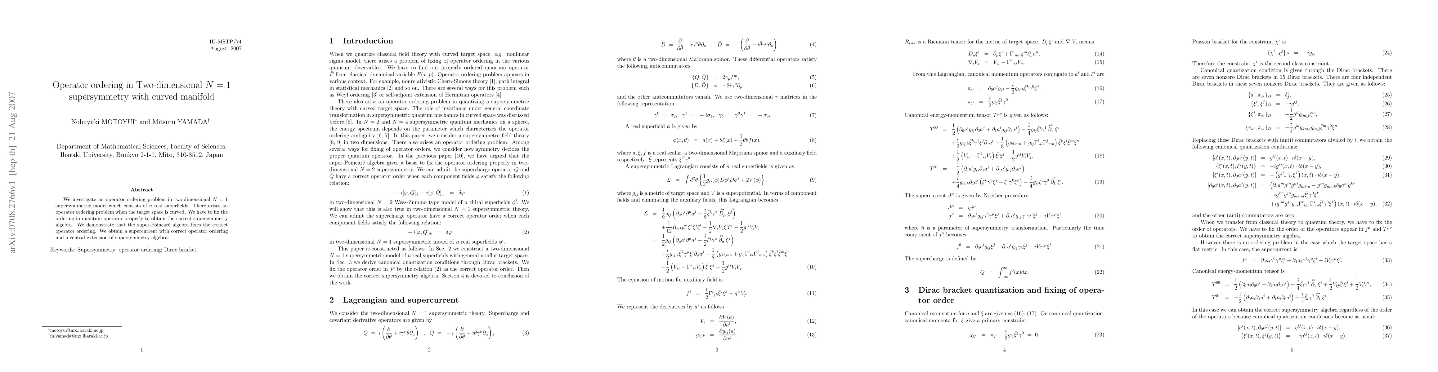 Researchers investigated operator ordering in a 2D N=1 supersymmetric model with curved manifold, finding that the super-Poincaré algebra fixes correct ordering to obtain a supersymmetry algebra with a central extension.