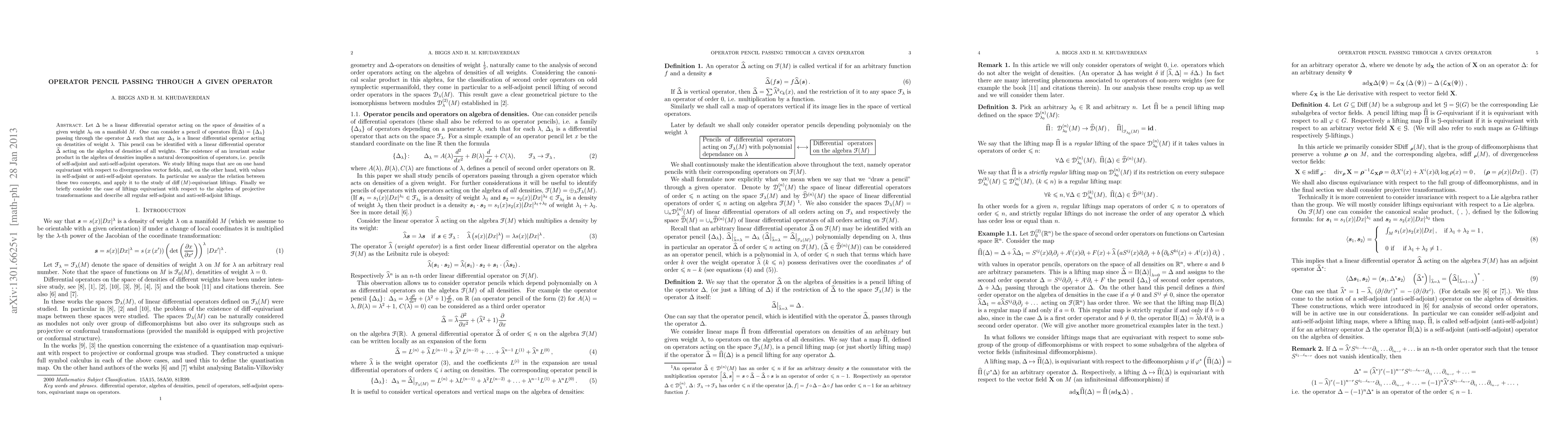 Let $\Delta$ be a linear differential operator acting on the space of densities of a given weight $\lo$ on a manifold $M$. One can consider a pencil of operators $\hPi(\Delta)=\{\Delta_\l\}$ passing through the operator $\Delta$ such that any $\Delta_\l$ is a linear differential operator acting on densities of weight $\l$. This pencil can be identified with a linear differential operator $\hD$ acting on the algebra of densities of all weights. The existence of an invariant scalar product in the algebra of densities implies a natural decomposition of operators, i.e. pencils of self-adjoint and anti-self-adjoint operators. We study lifting maps that are on one hand equivariant with respect to divergenceless vector fields, and, on the other hand, with values in self-adjoint or anti-self-adjoint operators. In particular we analyze the relation between these two concepts, and apply it to the study of $\diff(M)$-equivariant liftings. Finally we briefly consider the case of liftings equivariant with respect to the algebra of projective transformations and describe all regular self-adjoint and anti-self-adjoint liftings.