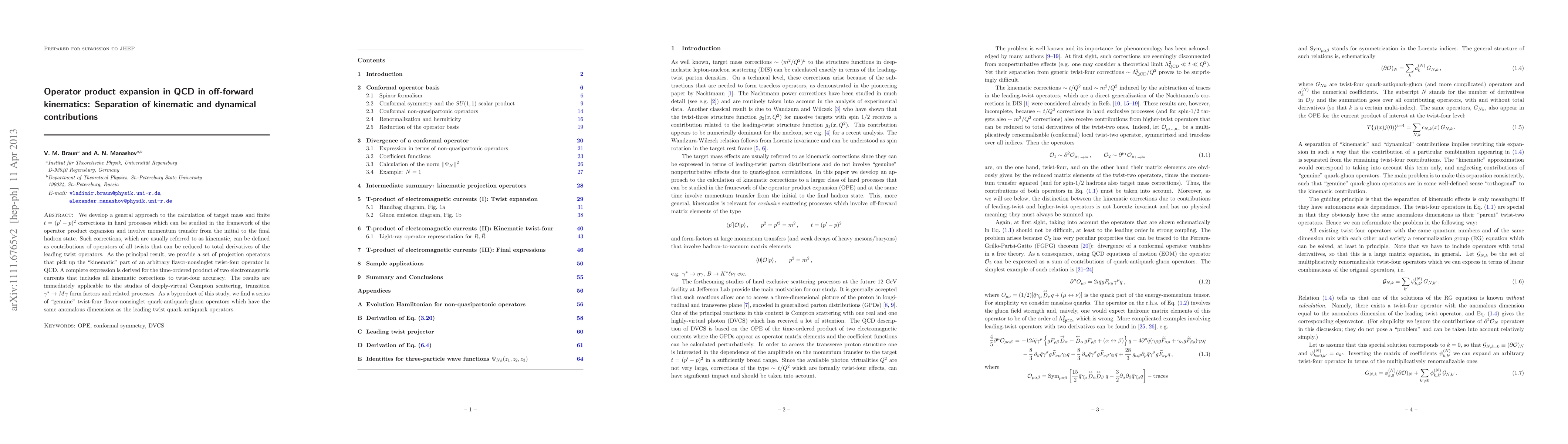 We develop a general approach to the calculation of target mass and finite t=(p'-p)^2 corrections in hard processes which can be studied in the framework of the operator product expansion and involve momentum transfer from the initial to the final hadron state. Such corrections, which are usually referred to as kinematic, can be defined as contributions of operators of all twists that can be reduced to total derivatives of the leading twist operators. As the principal result, we provide a set of projection operators that pick up the "kinematic" part of an arbitrary flavor-nonsinglet twist-four operator in QCD. A complete expression is derived for the time-ordered product of two electromagnetic currents that includes all kinematic corrections to twist-four accuracy. The results are immediately applicable to the studies of deeply-virtual Compton scattering, transition gamma^*-> M gamma form factors and related processes. As a byproduct of this study, we find a series of "genuine" twist-four flavor-nonsinglet quark-antiquark-gluon operators which have the same anomalous dimensions as the leading twist quark-antiquark operators.