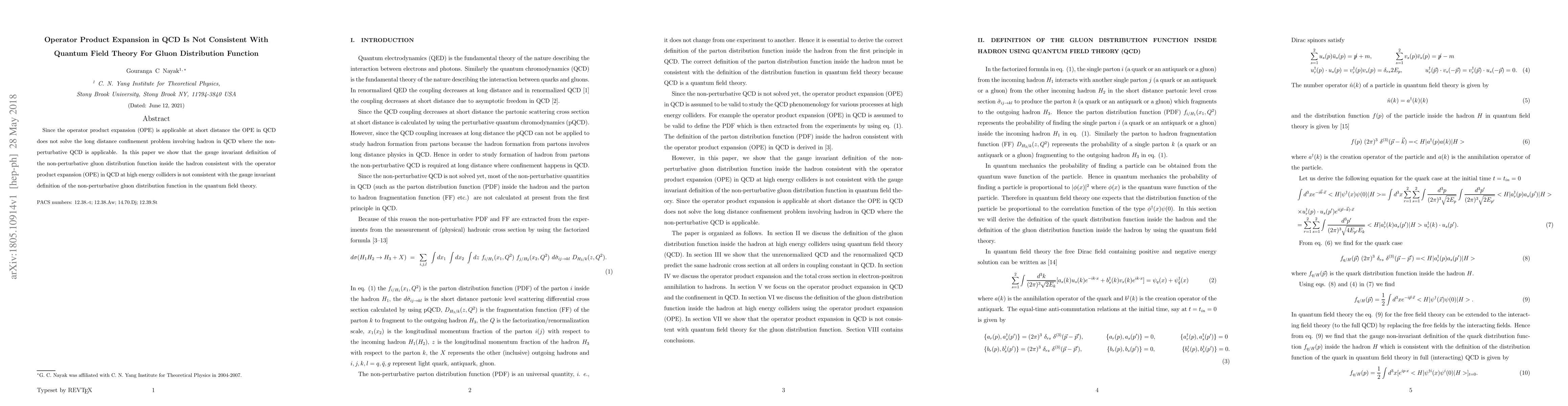 Since the operator product expansion (OPE) is applicable at short distance the OPE in QCD does not solve the long distance confinement problem involving hadron in QCD where the non-perturbative QCD is applicable. In this paper we show that the gauge invariant definition of the non-perturbative gluon distribution function inside the hadron consistent with the operator product expansion (OPE) in QCD at high energy colliders is not consistent with the gauge invariant definition of the non-perturbative gluon distribution function in the quantum field theory.