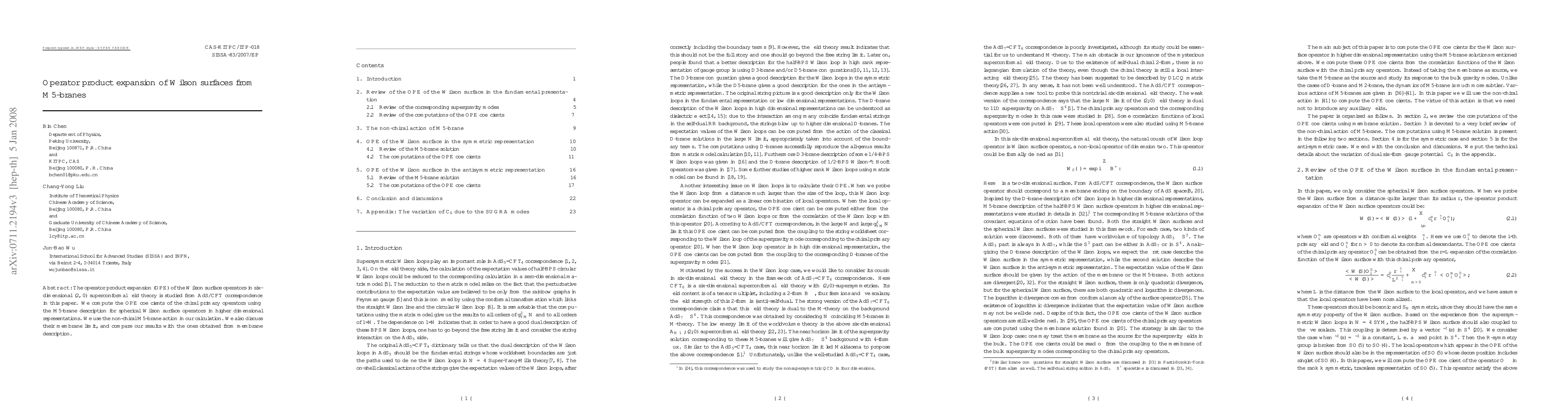 This paper investigates the operator product expansion (OPE) of Wilson surface operators in six-dimensional (2, 0) superconformal field theory via the AdS/CFT correspondence, computing OPE coefficients using M5-brane descriptions and comparing results with membrane limit calculations.