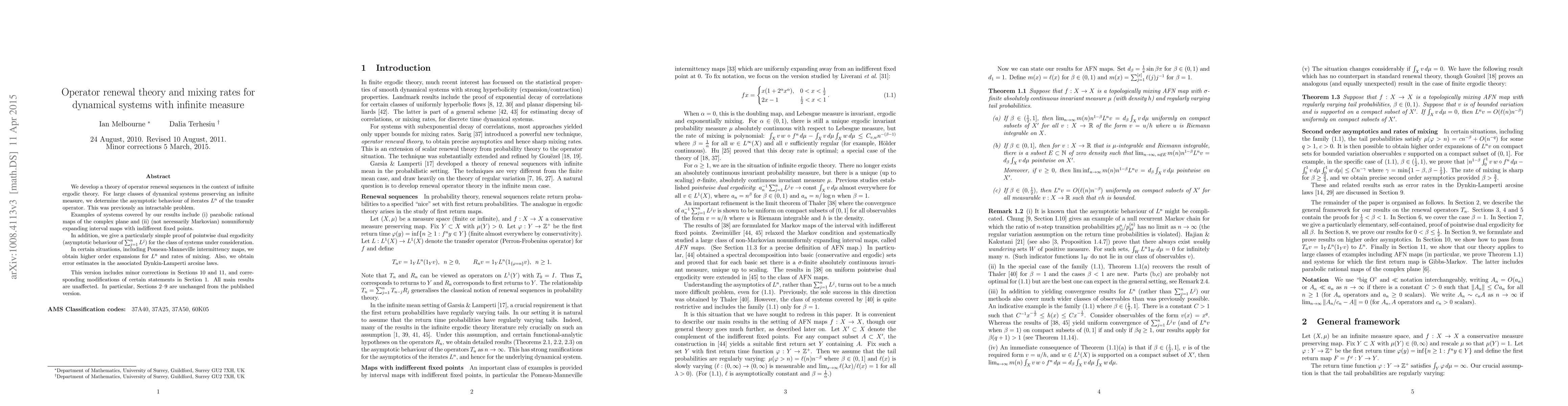 This paper develops a novel operator renewal theory for dynamical systems with infinite measure, determining the asymptotic behavior of transfer operator iterates for systems like parabolic rational maps and nonuniformly expanding interval maps. It also provides a simple proof of pointwise dual ergodicity and higher-order mixing rates for specific systems.