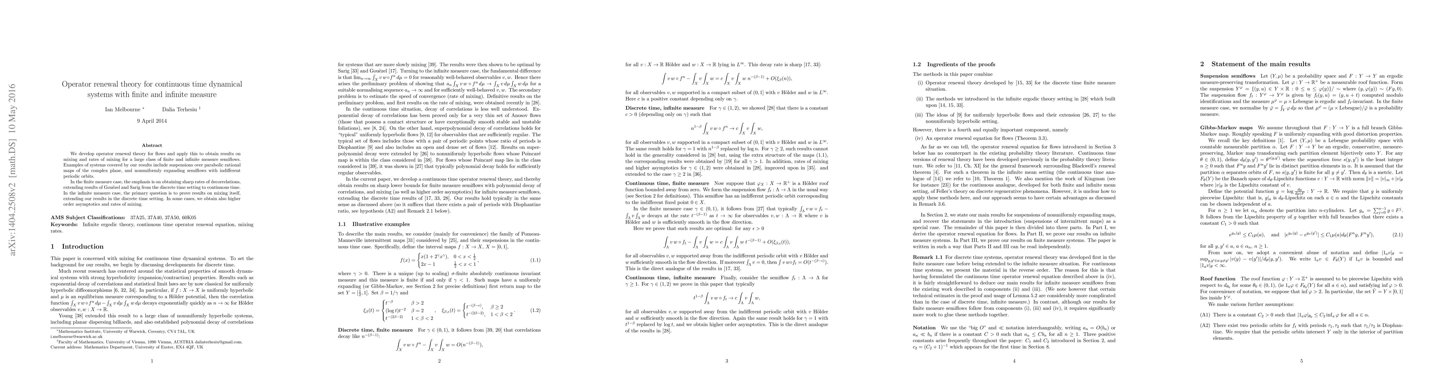 This paper develops operator renewal theory for continuous time dynamical systems, applying it to derive mixing and rates of mixing for semiflows with finite and infinite measures. The study extends discrete time results to continuous time, focusing on sharp decorrelation rates and proving mixing properties for systems like suspensions over parabolic maps and nonuniformly expanding semiflows.