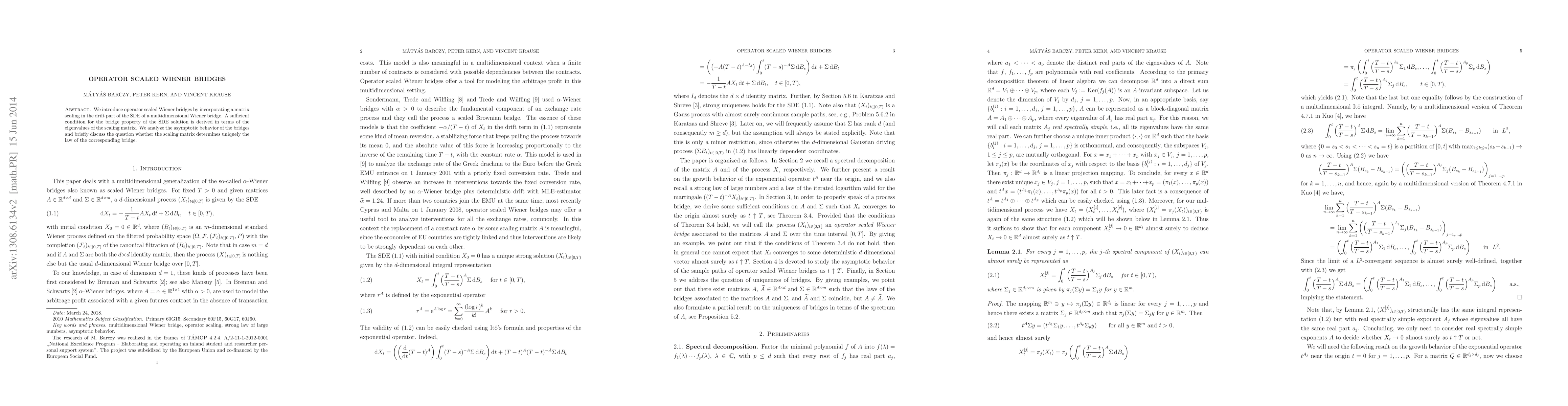 This paper introduces operator scaled Wiener bridges, which modify the drift part of a multidimensional Wiener bridge using a matrix scaling. It derives a condition for the bridge property based on the scaling matrix's eigenvalues and explores the asymptotic behavior of these bridges.