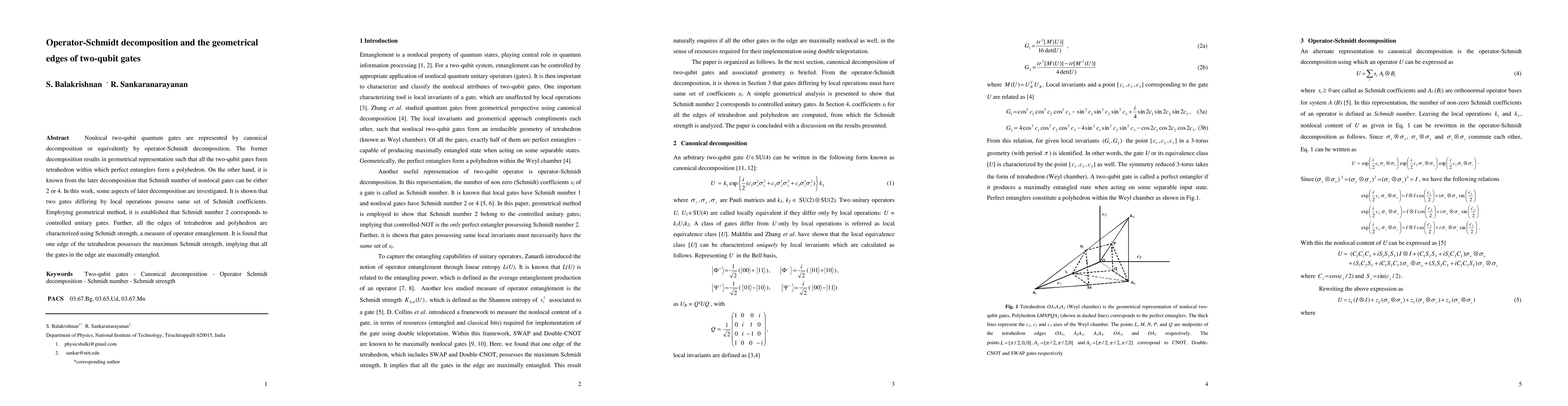 This paper investigates the operator-Schmidt decomposition of nonlocal two-qubit quantum gates, demonstrating that gates differing by local operations share the same Schmidt coefficients. It establishes that Schmidt number 2 corresponds to controlled unitary gates and characterizes the edges of the tetrahedron representing these gates, finding that one edge has maximum Schmidt strength, indicating maximal entanglement.