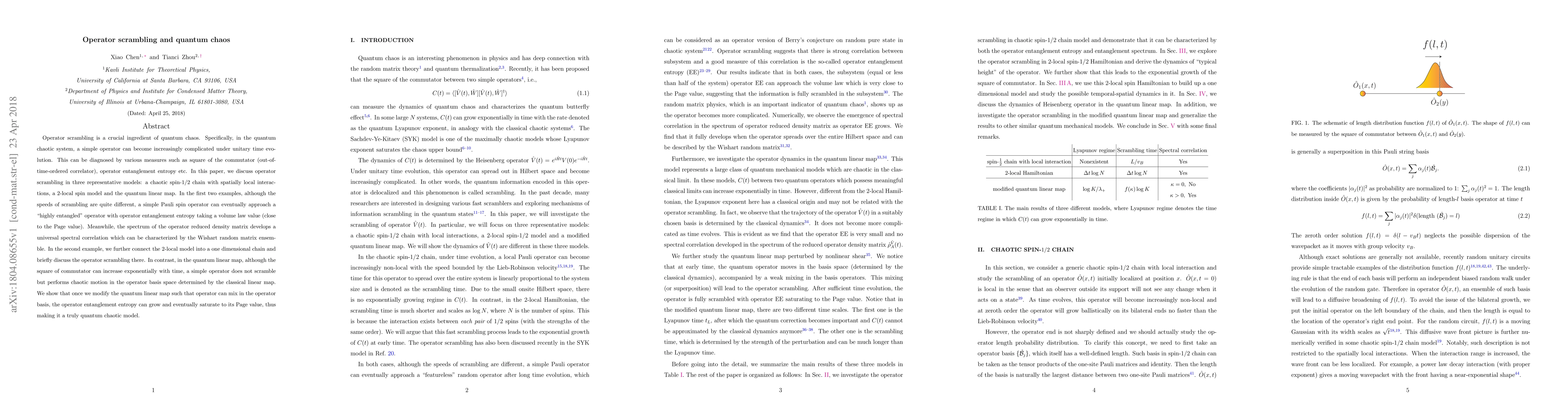 Operator scrambling is a crucial ingredient of quantum chaos. Specifically, in the quantum chaotic system, a simple operator can become increasingly complicated under unitary time evolution. This can be diagnosed by various measures such as square of the commutator (out-of-time-ordered correlator), operator entanglement entropy etc. In this paper, we discuss operator scrambling in three representative models: a chaotic spin-$1/2$ chain with spatially local interactions, a 2-local spin model and the quantum linear map. In the first two examples, although the speeds of scrambling are quite different, a simple Pauli spin operator can eventually approach a "highly entangled" operator with operator entanglement entropy taking a volume law value (close to the Page value). Meanwhile, the spectrum of the operator reduced density matrix develops a universal spectral correlation which can be characterized by the Wishart random matrix ensemble. In the second example, we further connect the 2-local model into a one dimensional chain and briefly discuss the operator scrambling there. In contrast, in the quantum linear map, although the square of commutator can increase exponentially with time, a simple operator does not scramble but performs chaotic motion in the operator basis space determined by the classical linear map. We show that once we modify the quantum linear map such that operator can mix in the operator basis, the operator entanglement entropy can grow and eventually saturate to its Page value, thus making it a truly quantum chaotic model.