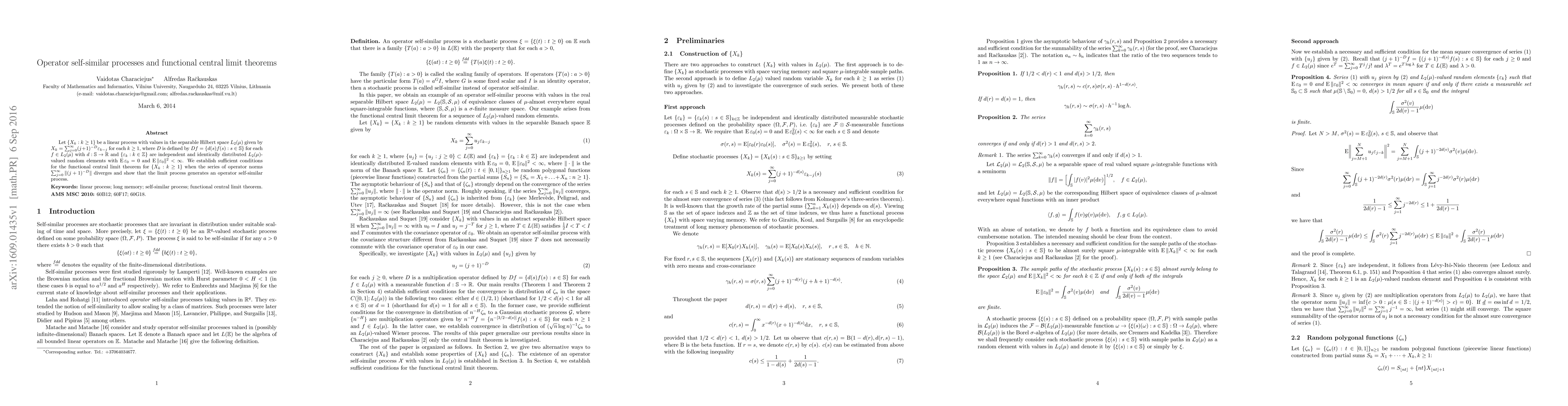 Let $\{X_k:k\ge1\}$ be a linear process with values in the separable Hilbert space $L_2(\mu)$ given by $X_k=\sum_{j=0}^\infty(j+1)^{-D}\varepsilon_{k-j}$ for each $k\ge1$, where $D$ is defined by $Df=\{d(s)f(s):s\in\mathbb S\}$ for each $f\in L_2(\mu)$ with $d:\mathbb S\to\mathbb R$ and $\{\varepsilon_k:k\in\mathbb Z\}$ are independent and identically distributed $L_2(\mu)$-valued random elements with $\operatorname E\varepsilon_0=0$ and $\operatorname E\|\varepsilon_0\|^2<\infty$. We establish sufficient conditions for the functional central limit theorem for $\{X_k:k\ge1\}$ when the series of operator norms $\sum_{j=0}^\infty\|(j+1)^{-D}\|$ diverges and show that the limit process generates an operator self-similar process.