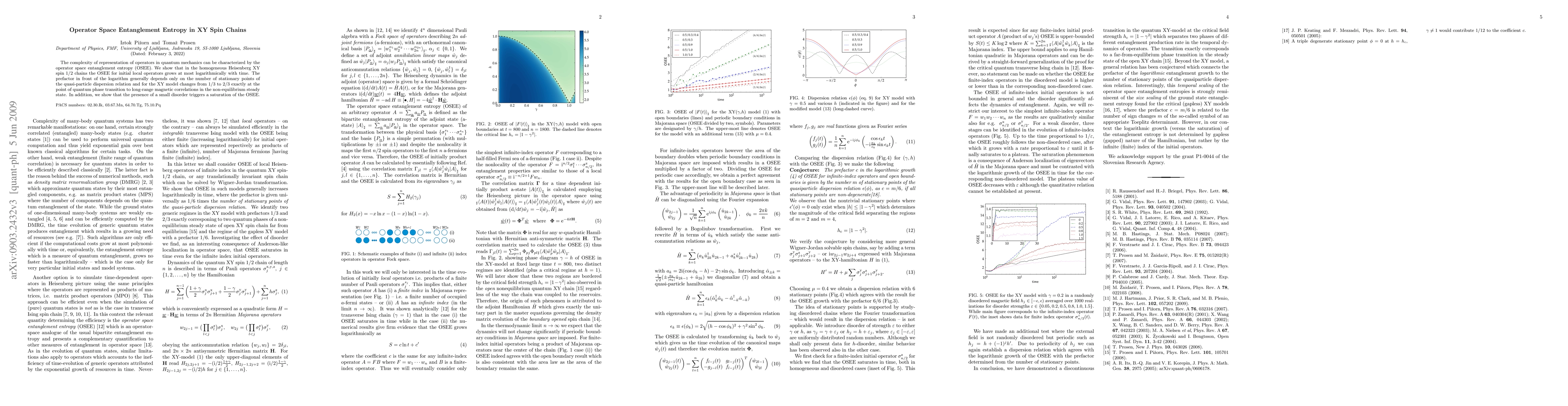 This paper investigates the operator space entanglement entropy (OSEE) in homogeneous Heisenberg XY spin 1/2 chains, finding that it grows logarithmically over time, with a prefactor dependent on the quasi-particle dispersion relation's stationary points. Near the quantum phase transition, the prefactor changes from 1/3 to 2/3, and disorder causes OSEE saturation.