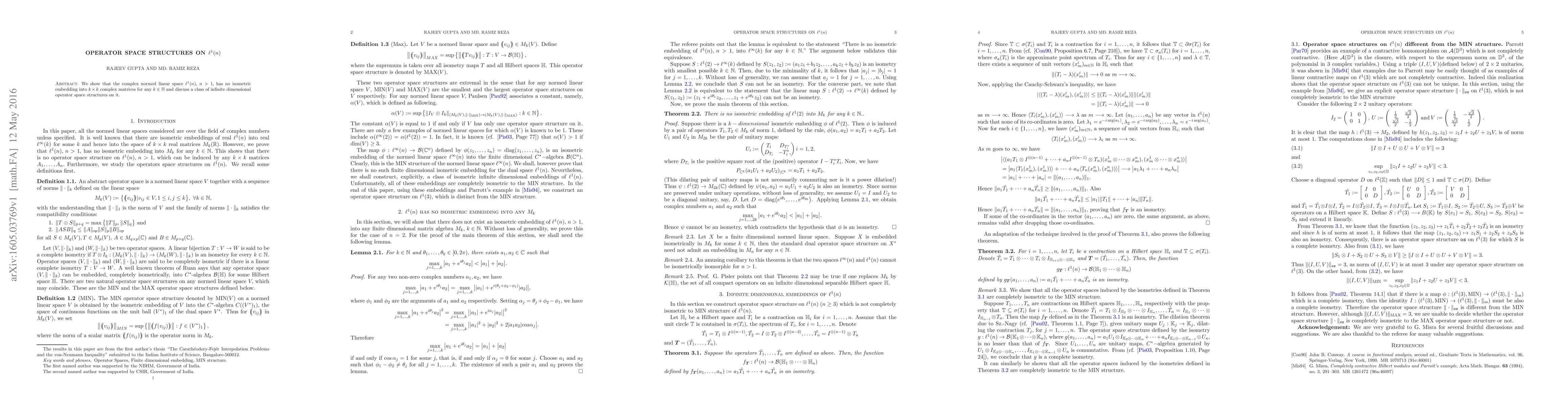 We show that the complex normed linear space $\ell^1(n),$ $n>1,$ has no isometric embedding into $k\times k$ complex matrices for any $k\in \mathbb{N}$ and discuss a class of infinite dimensional operator space structures on it.