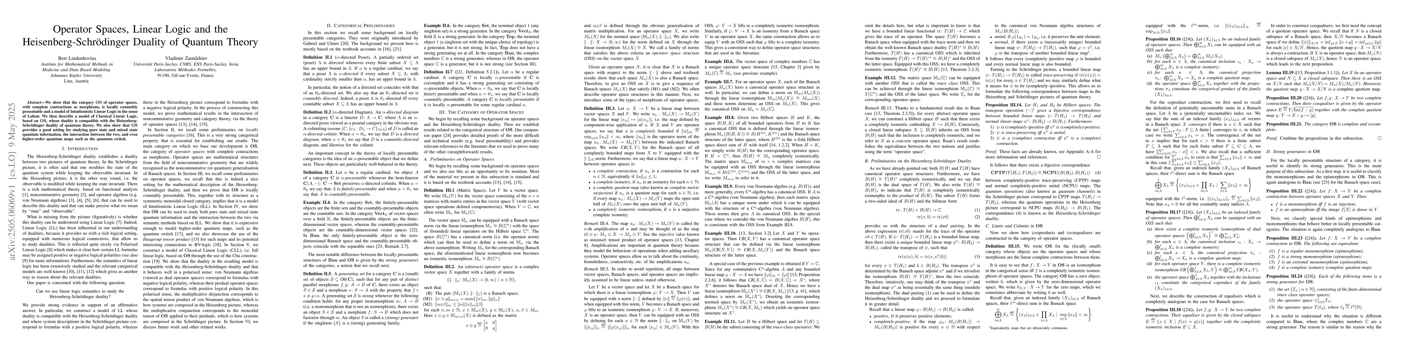 The paper demonstrates that operator spaces form a locally countably presentable category and a model of Intuitionistic Linear Logic, extending to Classical Linear Logic with a duality compatible with quantum theory's Heisenberg-Schrödinger duality.
