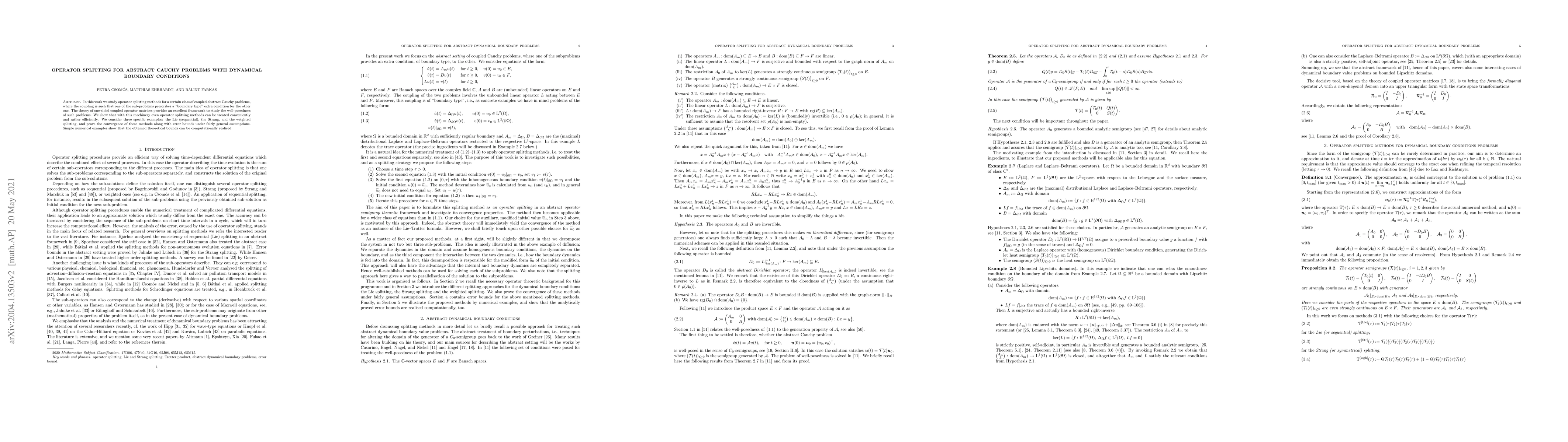 In this work we study operator splitting methods for a certain class of coupled abstract Cauchy problems, where the coupling is such that one of the problems prescribes a "boundary type" extra condition for the other one. The theory of one-sided coupled operator matrices provides an excellent framework to study the well-posedness of such problems. We show that with this machinery even operator splitting methods can be treated conveniently and rather efficiently. We consider three specific examples: the Lie (sequential), the Strang and the weighted splitting, and prove the convergence of these methods along with error bounds under fairly general assumptions.