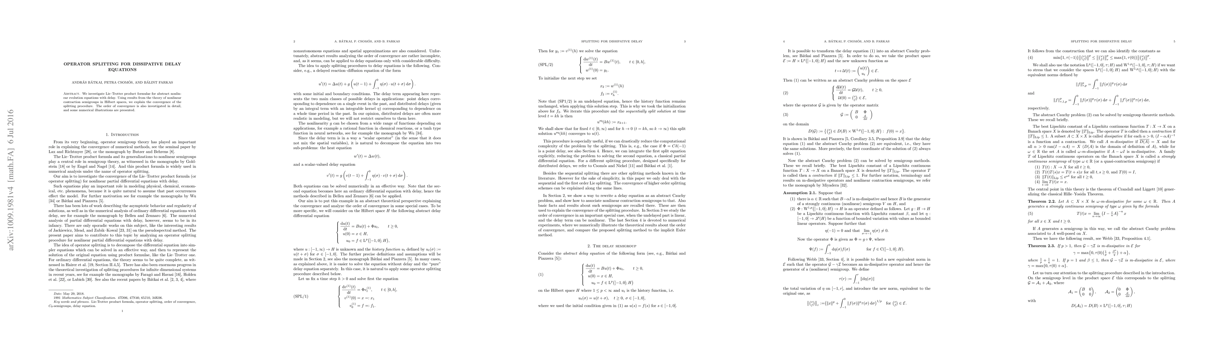 We investigate Lie-Trotter product formulae for abstract nonlinear evolution equations with delay. Using results from the theory of nonlinear contraction semigroups in Hilbert spaces, we explain the convergence of the splitting procedure. The order of convergence is also investigated in detail, and some numerical illustrations are presented.