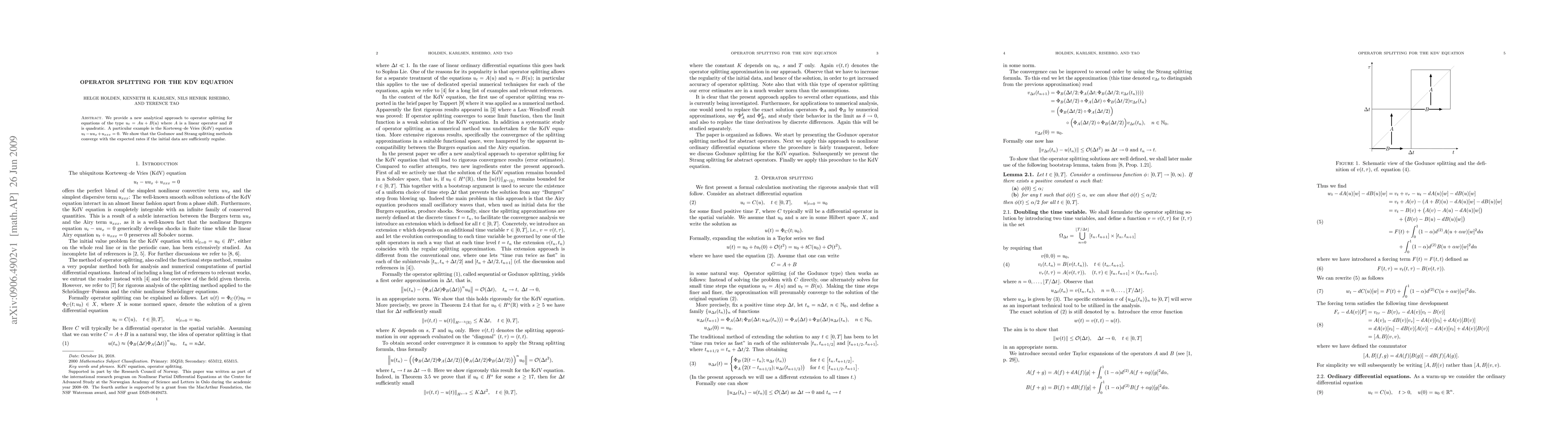 We provide a new analytical approach to operator splitting for equations of the type $u_t=Au+B(u)$ where $A$ is a linear operator and $B$ is quadratic. A particular example is the Korteweg-de Vries (KdV) equation $u_t-u u_x+u_{xxx}=0$. We show that the Godunov and Strang splitting methods converge with the expected rates if the initial data are sufficiently regular.