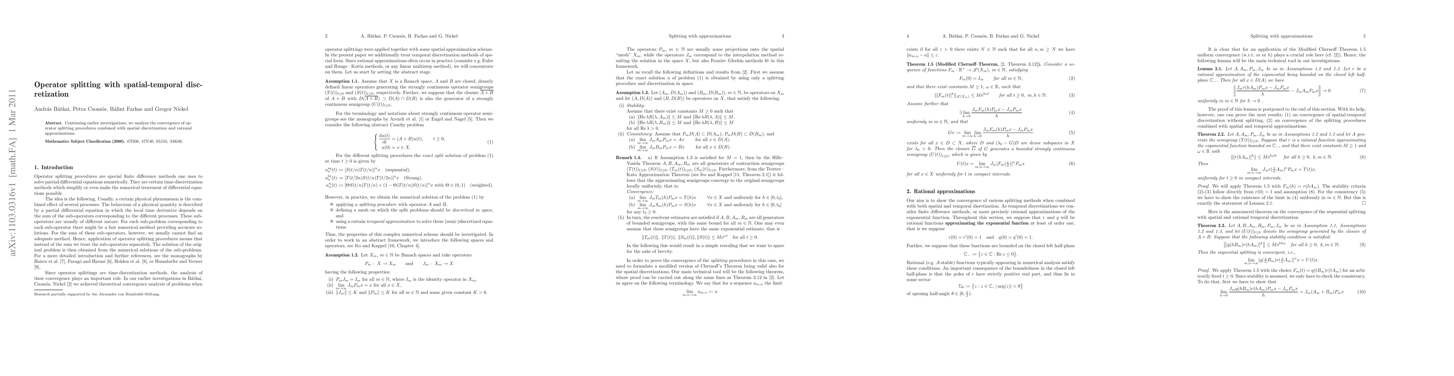 Continuing earlier investigations, we analyze the convergence of operator splitting procedures combined with spatial discretization and rational approximations.