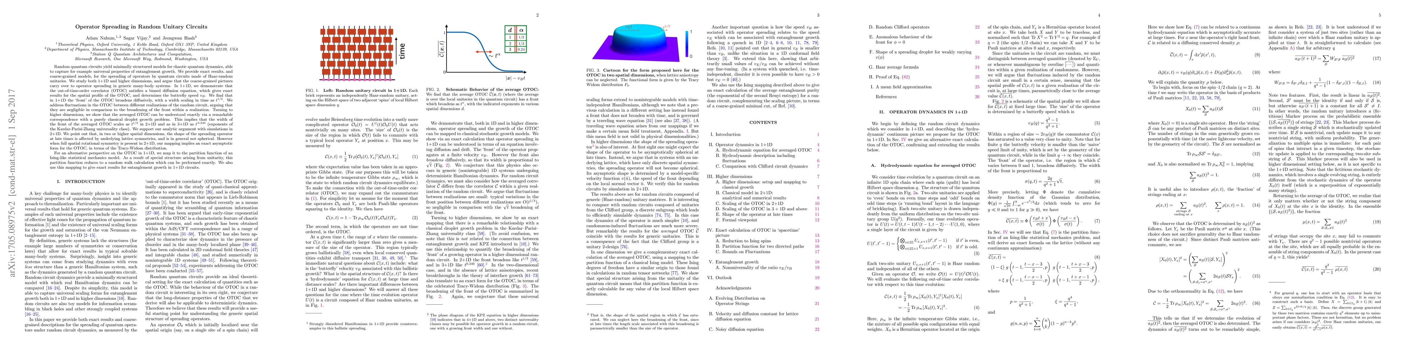 This paper investigates the spreading of operators in random quantum circuits composed of Haar-random unitaries, demonstrating exact results for the out-of-time-order correlator (OTOC) in both 1+1D and higher dimensions. In 1+1D, the OTOC front broadens diffusively with a $t^{1/2}$ scaling, while in 2+1D and 3+1D, it scales as $t^{1/3}$ and $t^{0.24}$ respectively, revealing a correspondence with classical droplet growth problems.