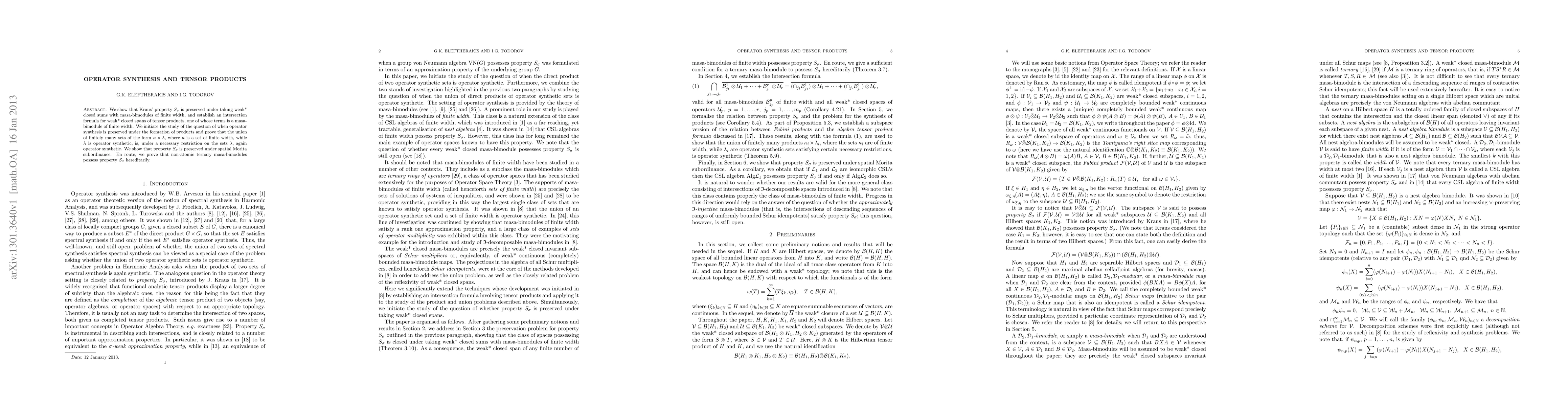 We show that Kraus' property $S_{\sigma}$ is preserved under taking weak* closed sums with masa-bimodules of finite width, and establish an intersection formula for weak* closed spans of tensor products, one of whose terms is a masa-bimodule of finite width. We initiate the study of the question of when operator synthesis is preserved under the formation of products and prove that the union of finitely many sets of the form $\kappa \times \lambda$, where $\kappa$ is a set of finite width, while $\lambda$ is operator synthetic, is, under a necessary restriction on the sets $\lambda$, again operator synthetic. We show that property $S_{\sigma}$ is preserved under spatial Morita subordinance. En route, we prove that non-atomic ternary masa-bimodules possess property $S_{\sigma}$ hereditarily.