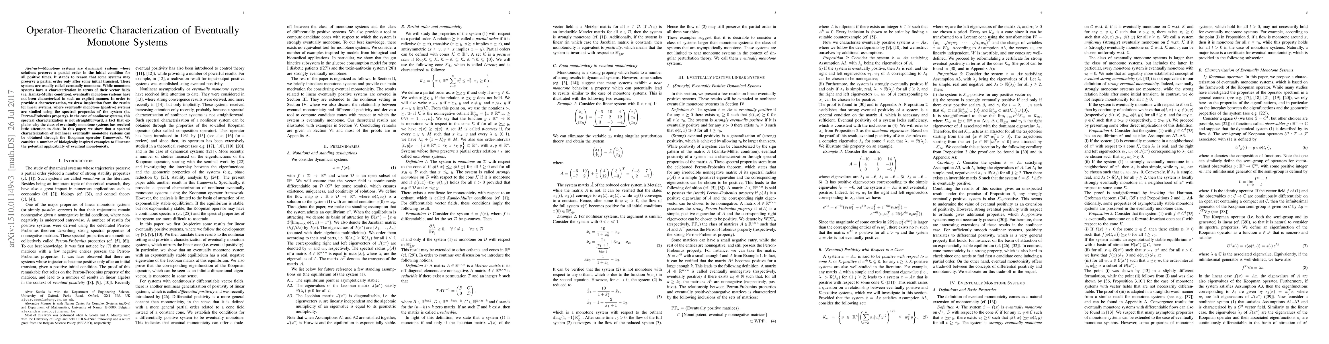Monotone systems are dynamical systems whose solutions preserve a partial order in the initial condition for all positive times. It stands to reason that some systems may preserve a partial order only after some initial transient. These systems are usually called eventually monotone. While monotone systems have a characterization in terms of their vector fields (i.e. Kamke-Muller condition), eventually monotone systems have not been characterized in such an explicit manner. In order to provide a characterization, we drew inspiration from the results for linear systems, where eventually monotone (positive) systems are studied using the spectral properties of the system (i.e. Perron-Frobenius property). In the case of nonlinear systems, this spectral characterization is not straightforward, a fact that explains why the class of eventually monotone systems has received little attention to date. In this paper, we show that a spectral characterization of nonlinear eventually monotone systems can be obtained through the Koopman operator framework. We consider a number of biologically inspired examples to illustrate the potential applicability of eventual monotonicity.
