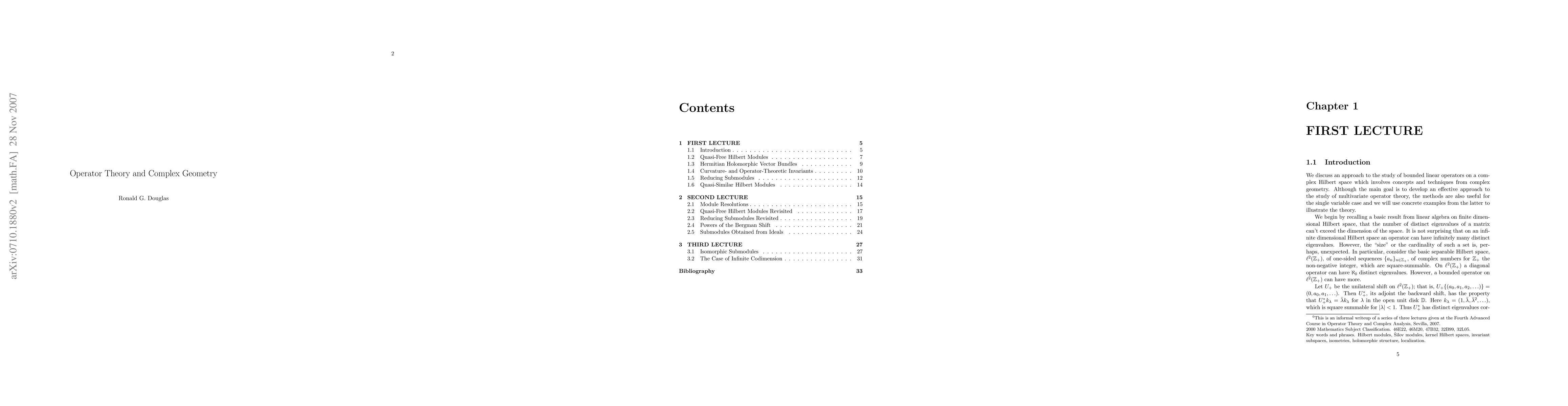 This paper introduces an approach to multivariate operator theory using algebraic and complex geometry, with a focus on Hilbert modules. It delves into examples related to hermitian holomorphic vector bundles, exploring submodules and reducing submodules in detail. Notable are the in-depth studies on Zhu's problem about reducing subspaces of Bergman shift powers and recent work on proper submodules unitarily equivalent to the original, offering new perspectives in organization and detail.