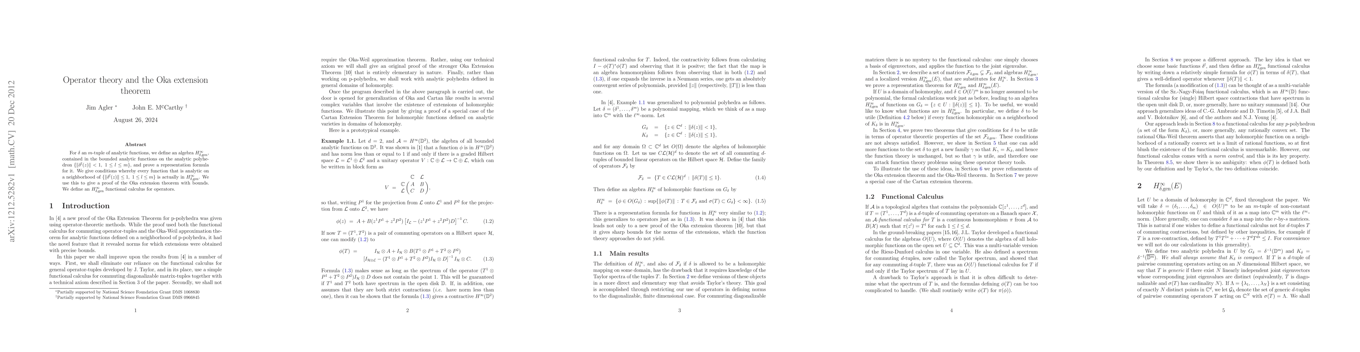 For $\delta$ an $m$-tuple of analytic functions, we define an algebra $\hidg$, contained in the bounded analytic functions on the analytic polyhedron $ {|\delta^l(z)| < 1, \ 1 \leq l \leq m}$, and prove a representation formula for it. We give conditions whereby every function that is analytic on a neighborhood of $ {|\delta^l(z)| \leq 1, \ 1 \leq l \leq m}$ is actually in $\hidg$. We use this to give a proof of the Oka extension theorem with bounds. We define an $\hidg$ functional calculus for operators.