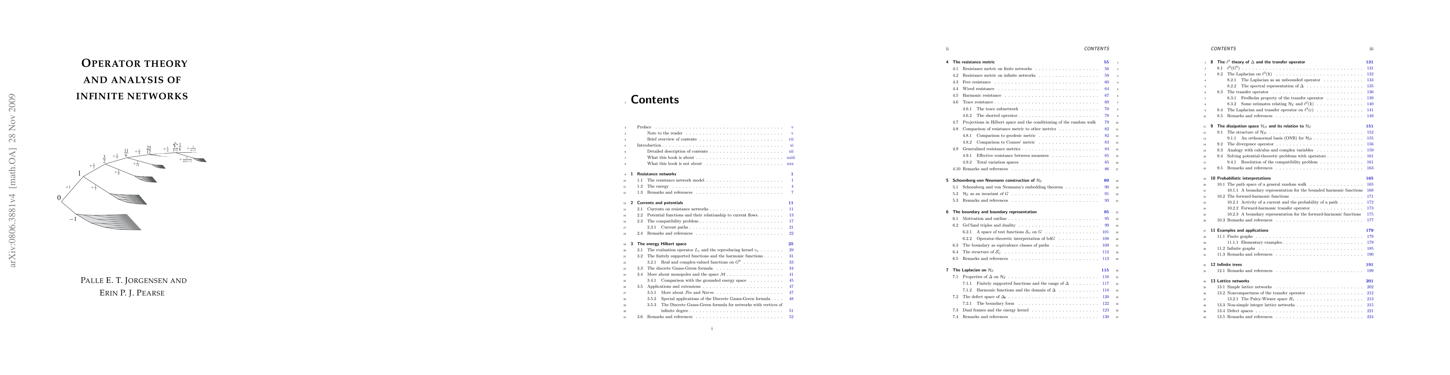 A resistance network is a weighted graph $(G,c)$ with intrinsic (resistance) metric $R$. We embed the resistance network into the Hilbert space ${\mathcal H}_{\mathcal E}$ of functions of finite energy. We use the resistance metric to study ${\mathcal H}_{\mathcal E}$, and vice versa and show that the embedded images of the vertices $\{v_x\}$ form a reproducing kernel for this Hilbert space. We also obtain a discrete version of the Gauss-Green formula for resistance networks and show that resistance networks which support nonconstant harmonic functions of finite energy have a certain type of \emph{boundary}. We obtain an analytic boundary representation for the harmonic functions of finite energy in a sense analogous to the Poisson or Martin boundary representations, but with different hypotheses, and for a different class of functions. In the process, we construct a dense space of "smooth" functions of finite energy and obtain a Gel'fand triple for ${\mathcal H}_{\mathcal E}$. This allows us to represent the resistance network as a system of Gaussian random variables indexed by vertices. We also study the spectral representation for $\Delta$ on ${\mathcal H}_{\mathcal E}$ and show how nonzero defect entails a nontrivial boundary. All of the above are are detected by the operator theory of ${\mathcal H}_{\mathcal E}$ but not $\ell^2$. Our results apply to the Heisenberg model for the isotropic ferromagnet, improving earlier results of R. T. Powers on the problem of long-range order (in reference to KMS states on the $C^\ast$-algebra of the model).