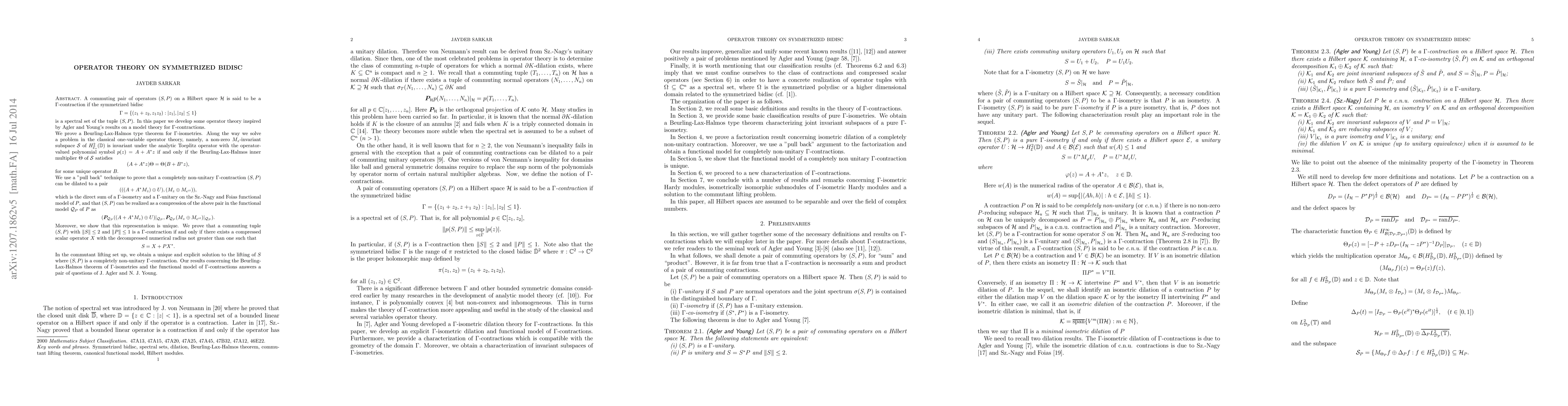 A commuting pair of operators (S, P) on a Hilbert space H is said to be a Gamma-contraction if the symmetrized bidisc is a spectral set of the tuple (S, P). In this paper we develop some operator theory inspired by Agler and Young's results on a model theory for Gamma-contractions. We prove a Beurling-Lax-Halmos type theorem for Gamma-isometries. Along the way we solve a problem in the classical one-variable operator theory. We use a "pull back" technique to prove that a completely non-unitary Gamma-contraction (S, P) can be dilated to a direct sum of a Gamma-isometry and a Gamma-unitary on the Sz.-Nagy and Foias functional model of P, and that (S, P) can be realized as a compression of the above pair in the functional model of P. Moreover, we show that the representation is unique. We prove that a commuting tuple (S, P) with |S| \leq 2 and |P \leq 1 is a Gamma-contraction if and only if there exists a compressed scalar operator X with the decompressed numerical radius not greater than one such that S = X + P X^*. In the commutant lifting set up, we obtain a unique and explicit solution to the lifting of S where (S, P) is a completely non-unitary Gamma-contraction. Our results concerning the Beurling-Lax-Halmos theorem of Gamma-isometries and the functional model of Gamma-contractions answers a pair of questions of J. Agler and N. J. Young.
