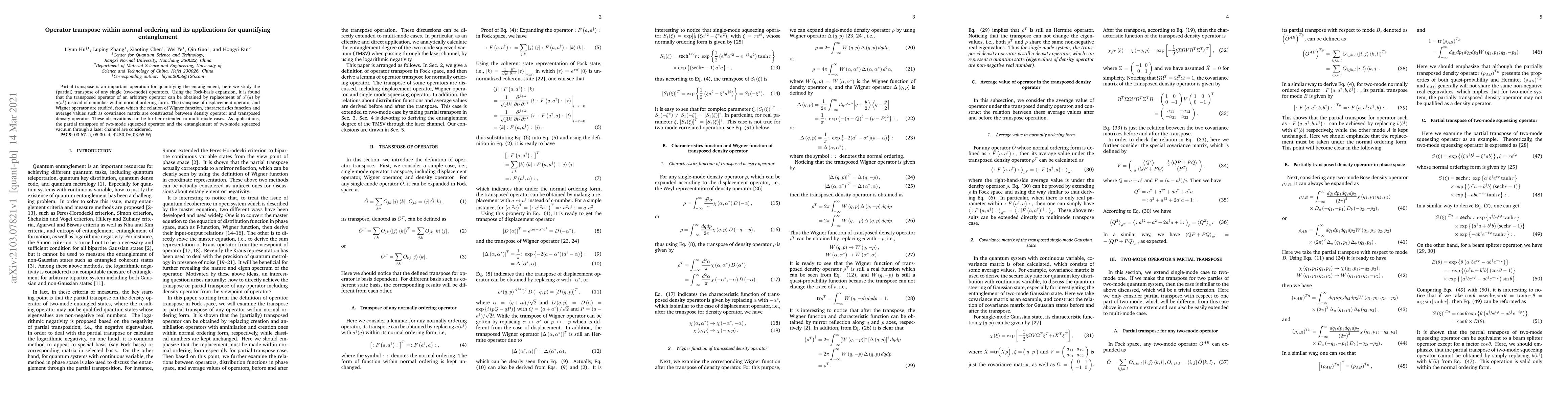 This paper explores the operator transpose within normal ordering to quantify entanglement, revealing that the transposed operator can be obtained by replacing a^{†} with a and vice versa. It applies these findings to displacement and Wigner operators, constructing relationships between density operators and their transposes, and extends the analysis to multi-mode cases, with applications to two-mode squeezed operators and entanglement in laser channels.