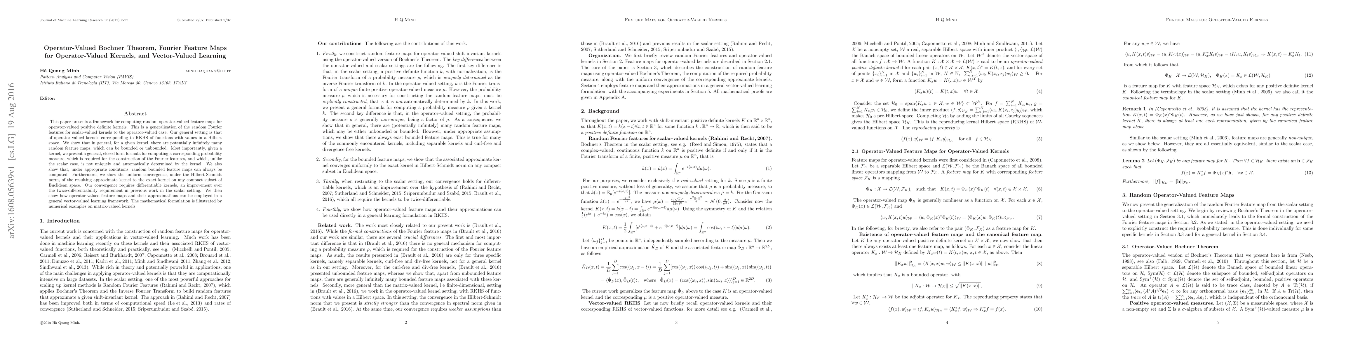 This paper presents a framework for computing random operator-valued feature maps for operator-valued positive definite kernels. This is a generalization of the random Fourier features for scalar-valued kernels to the operator-valued case. Our general setting is that of operator-valued kernels corresponding to RKHS of functions with values in a Hilbert space. We show that in general, for a given kernel, there are potentially infinitely many random feature maps, which can be bounded or unbounded. Most importantly, given a kernel, we present a general, closed form formula for computing a corresponding probability measure, which is required for the construction of the Fourier features, and which, unlike the scalar case, is not uniquely and automatically determined by the kernel. We also show that, under appropriate conditions, random bounded feature maps can always be computed. Furthermore, we show the uniform convergence, under the Hilbert-Schmidt norm, of the resulting approximate kernel to the exact kernel on any compact subset of Euclidean space. Our convergence requires differentiable kernels, an improvement over the twice-differentiability requirement in previous work in the scalar setting. We then show how operator-valued feature maps and their approximations can be employed in a general vector-valued learning framework. The mathematical formulation is illustrated by numerical examples on matrix-valued kernels.
