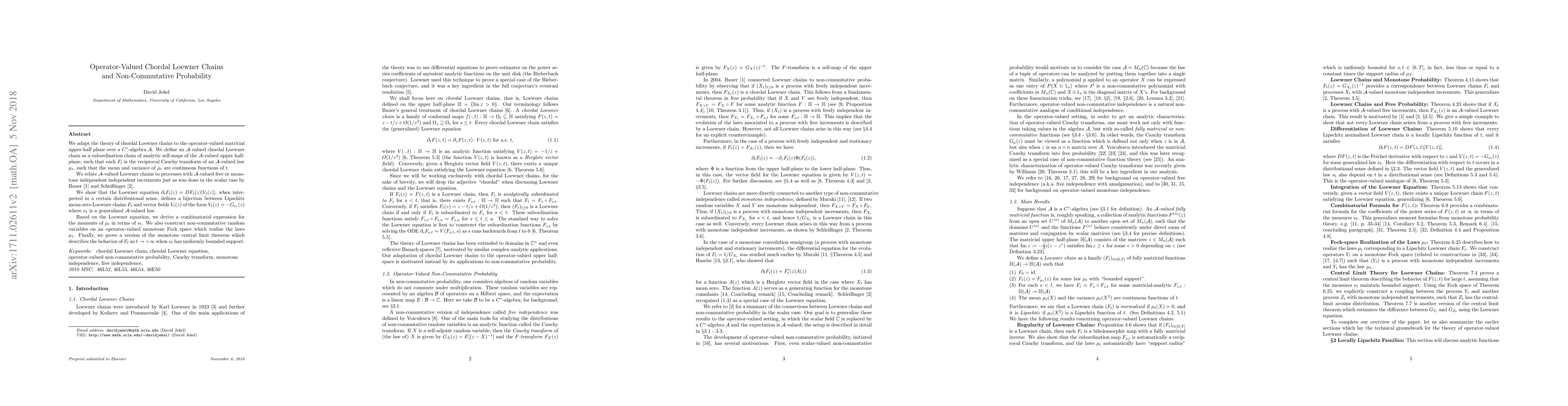 This paper extends the theory of chordal Loewner chains to operator-valued settings over a $C^*$-algebra $\mathcal{A}$, establishing connections to processes with $\mathcal{A}$-valued free or monotone independent increments. It derives a combinatorial expression for moments and proves a monotone central limit theorem, demonstrating the bijection between Loewner chains and generalized $\mathcal{A}$-valued laws.