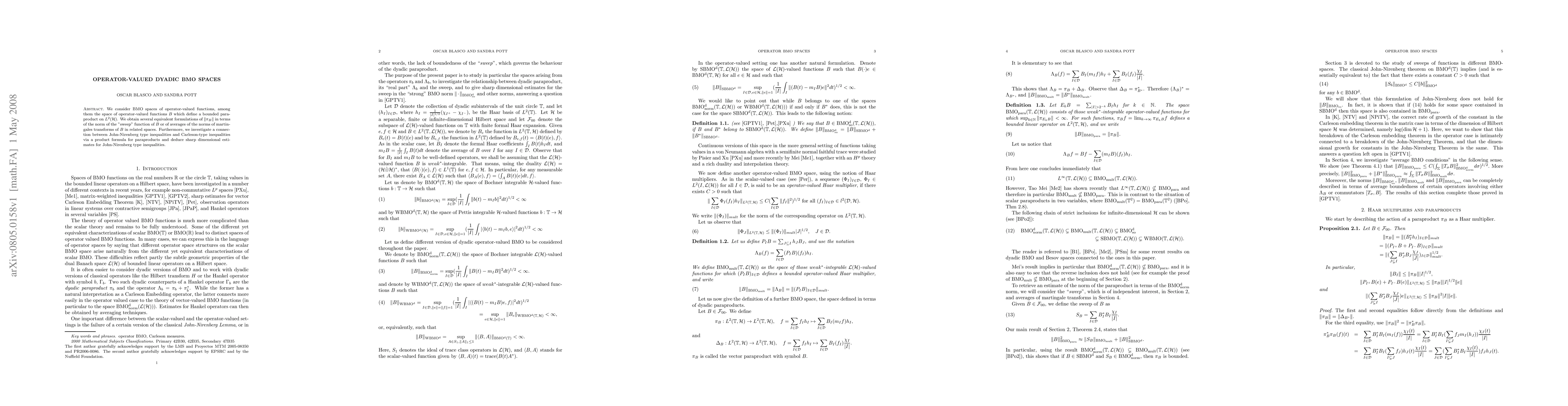 This paper explores operator-valued BMO spaces, focusing on functions that define bounded paraproducts on $L^2(H)$. It provides equivalent formulations of the norm of such functions and investigates connections between John-Nirenberg and Carleson inequalities, deriving sharp dimensional estimates.